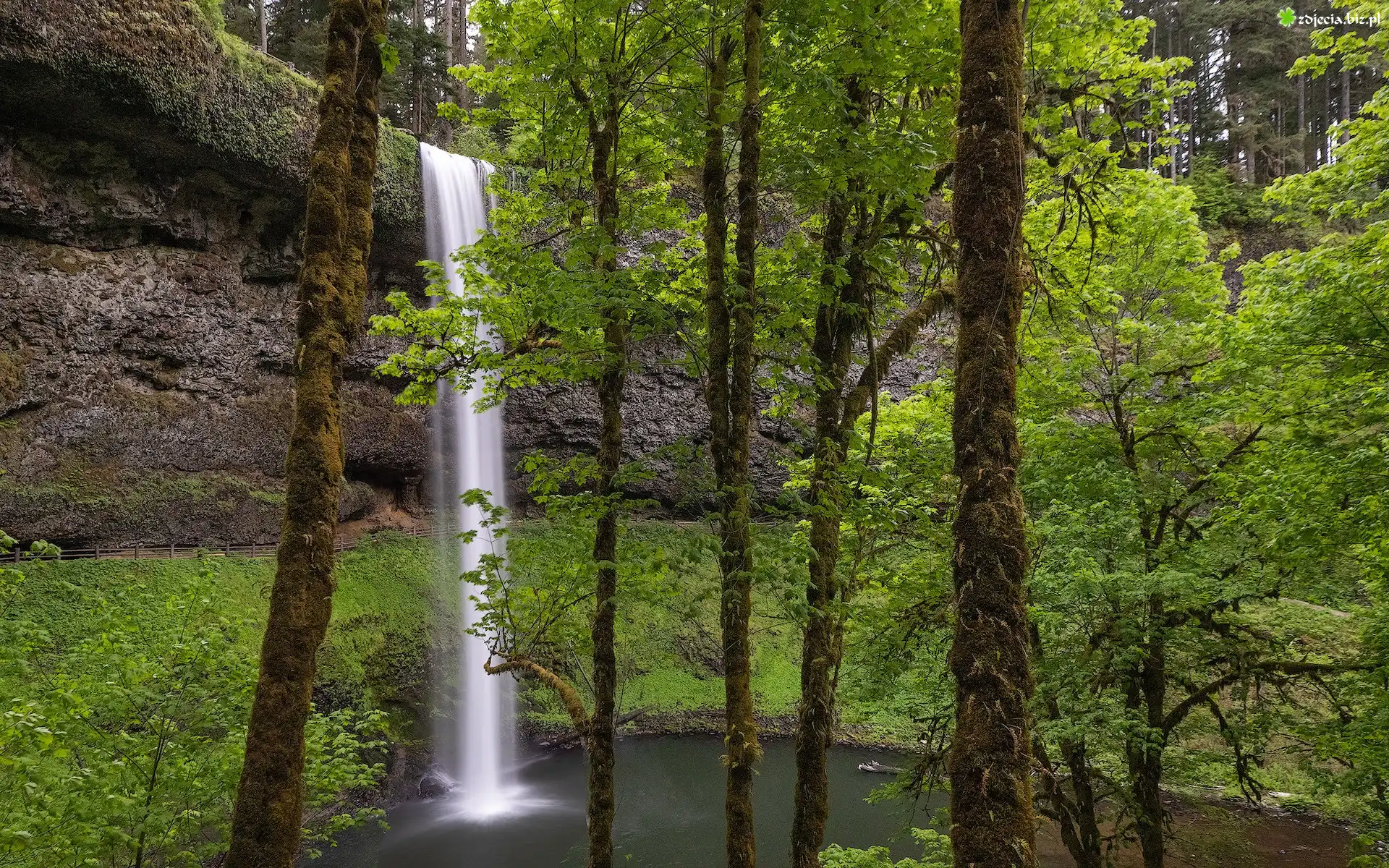 Zdjęcie Stany Zjednoczone, Oregon, Park stanowy, Silver Falls State Park, Wodospad South Falls, Omszałe, Drzewa |