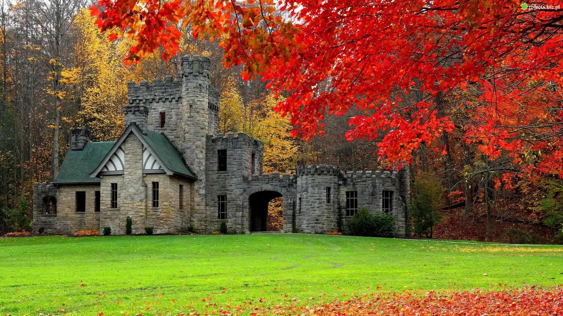 Zdjęcie Stany Zjednoczone, Stan Ohio, Miasto Willoughby Hills, Park North Chagrin Reservation, Squires Castle - Zamek Giermka, Jesień, Drzewa |