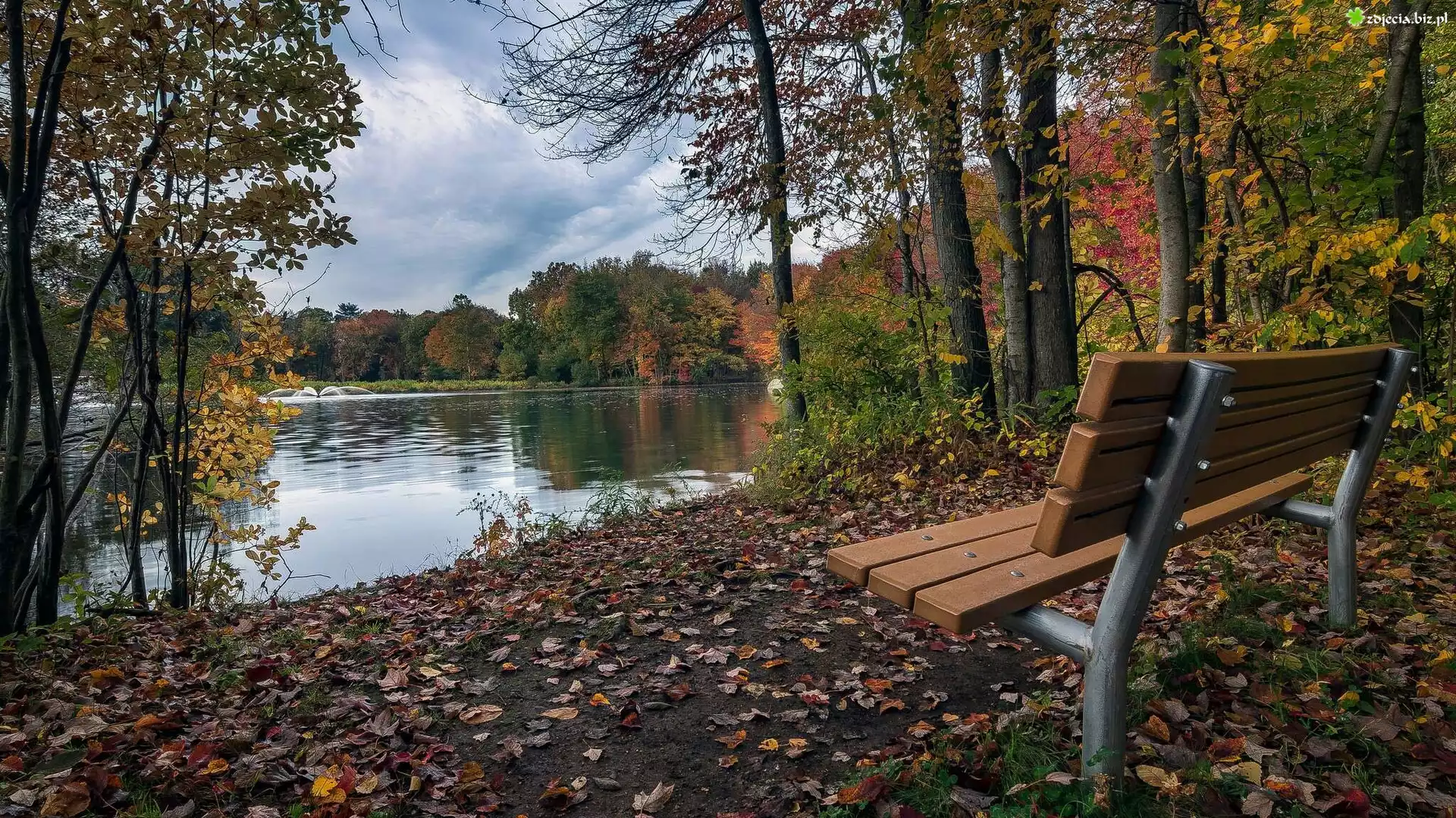 Zdjęcie Stany Zjednoczone, Stan Connecticut, Miasto Trumbull, Park Twin Brooks, Jezioro, Drzewa, Ławka, Liście |