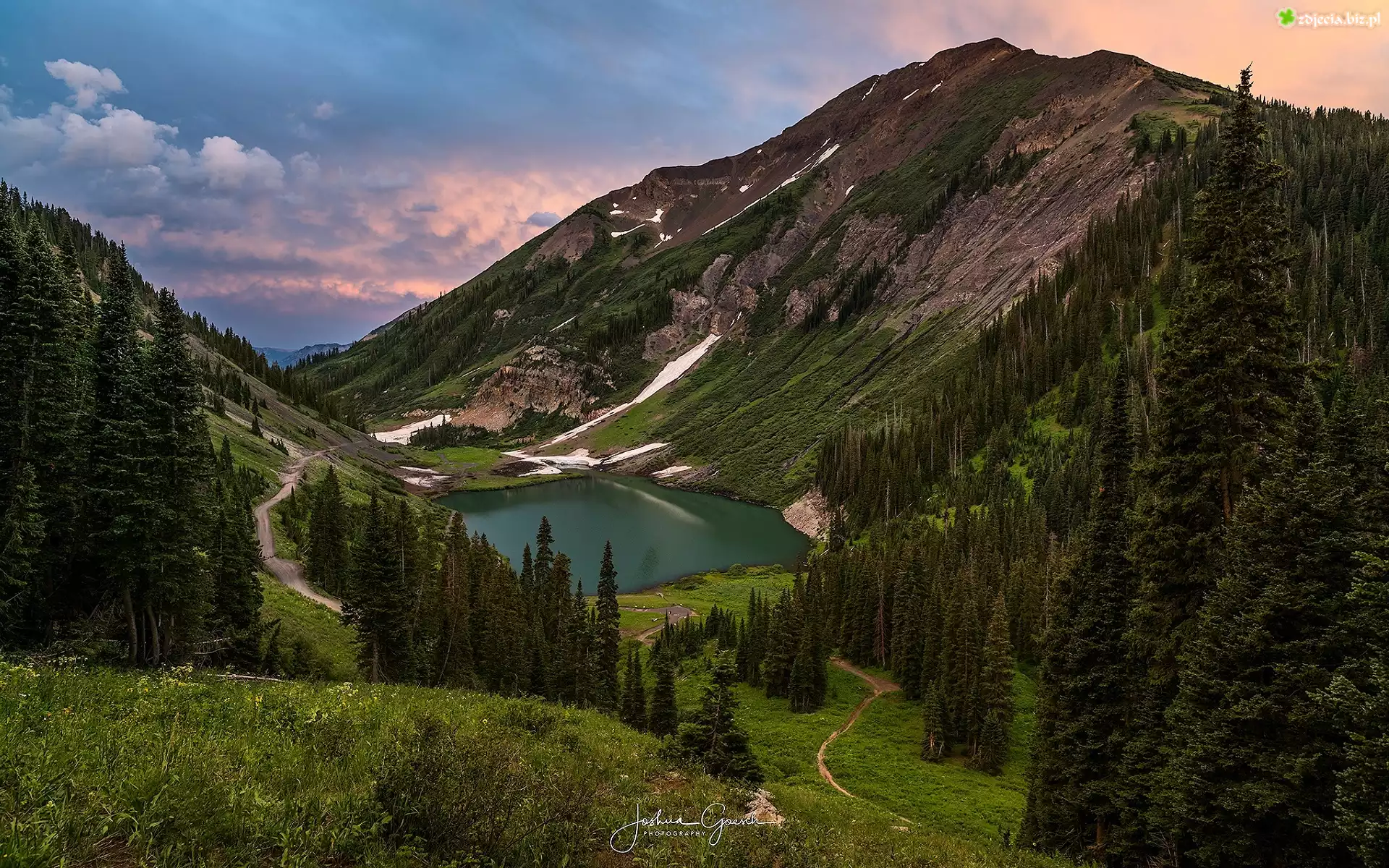 Zdjęcie Góry, Elk Mountains, Ścieżki, Przełęcz, Schofield Pass, Jezioro, Emerald Lake, Las, Drzewa, Świerki, Zachód słońca, Hrabstwo Delta, Stan Kolorado, Stany Zjednoczone |