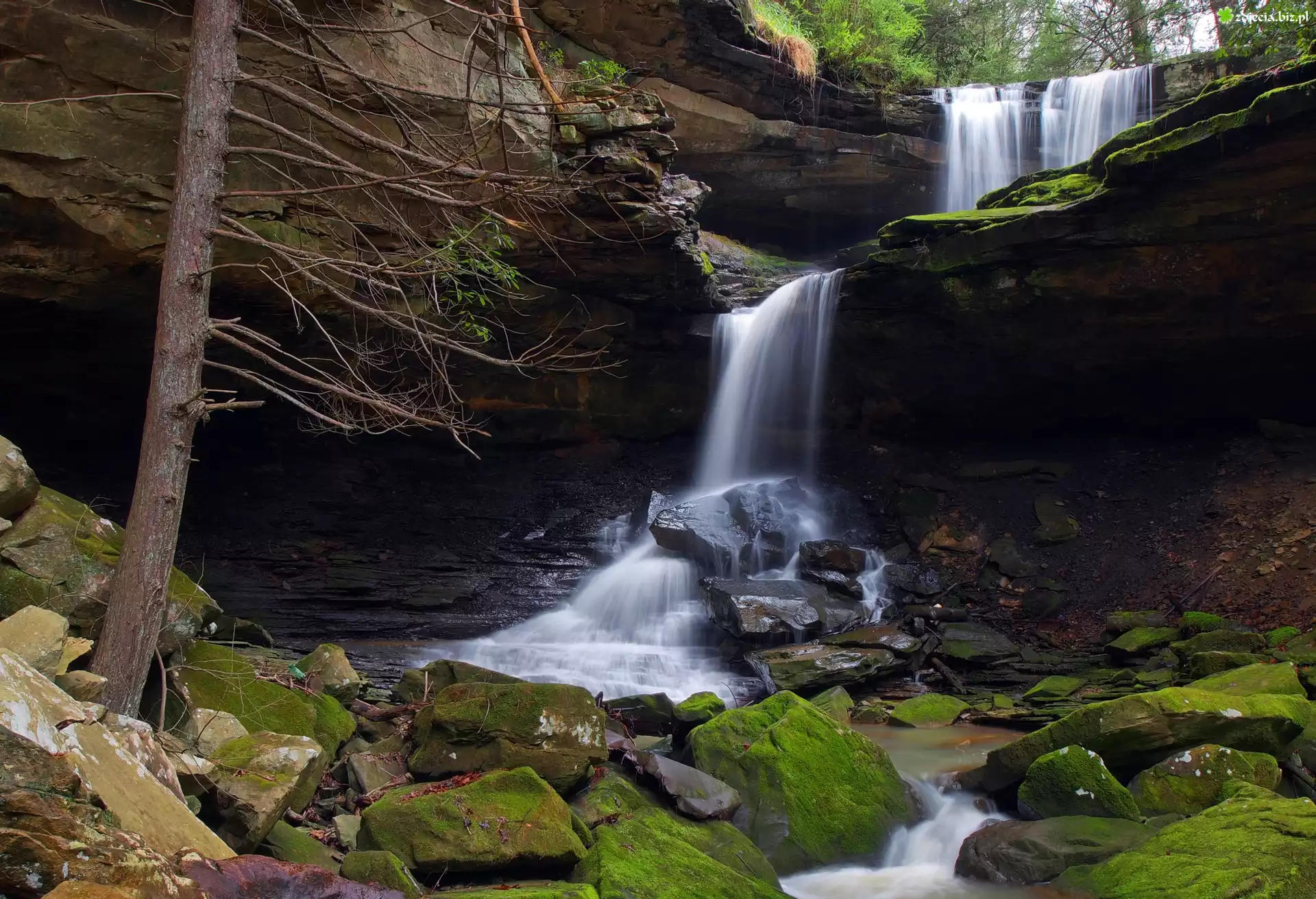 Zdjęcie Stany Zjednoczone, Stan Kentucky, Hrabstwo Jackson, Wodospady McCammon Branch, Skały, Drzewo, Omszałe, Kamienie |