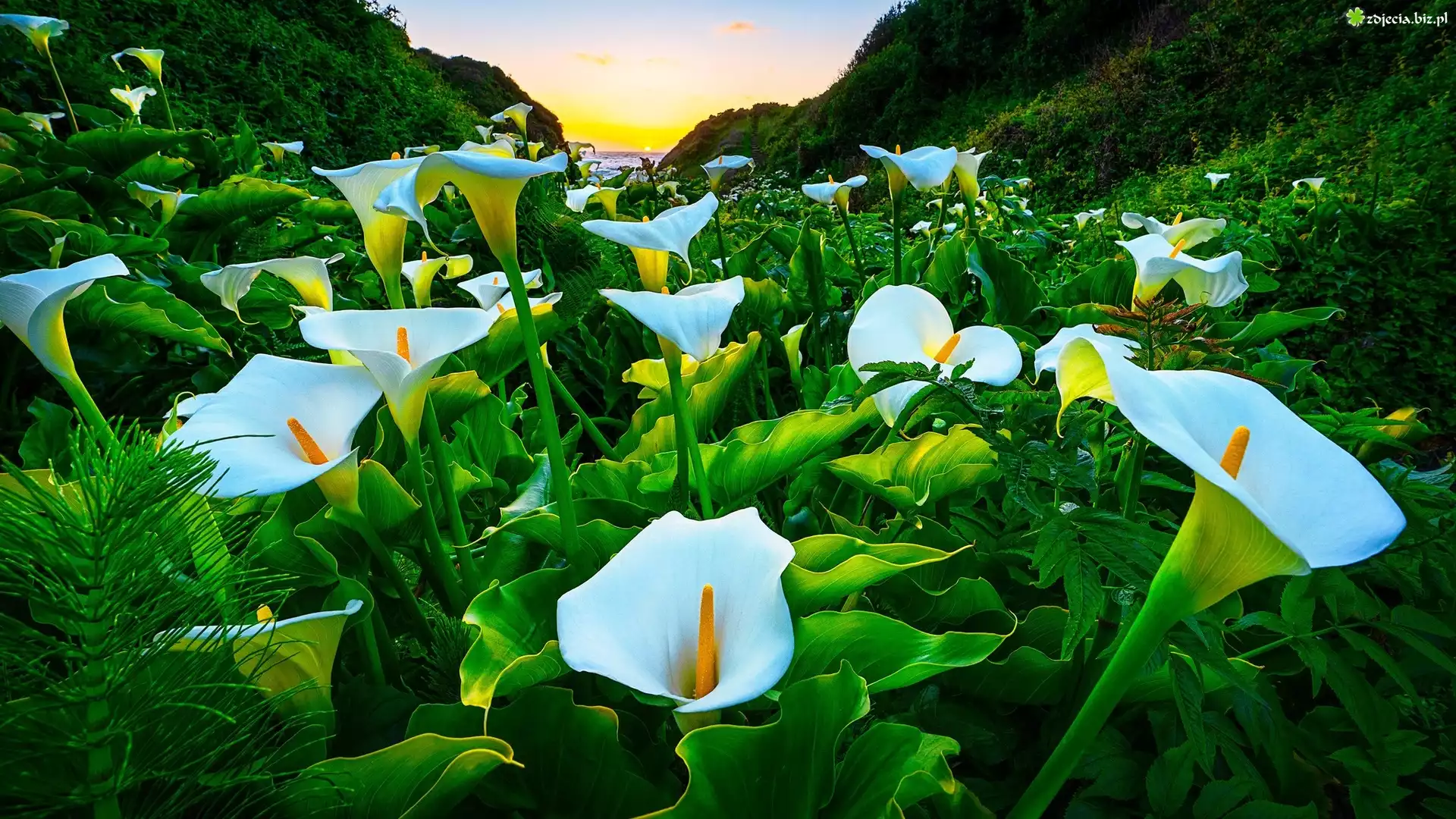 Zdjęcie Stany Zjednoczone, Kalifornia, Park stanowy Garrapata, Góry, Dolina, Kwiaty, Kalie