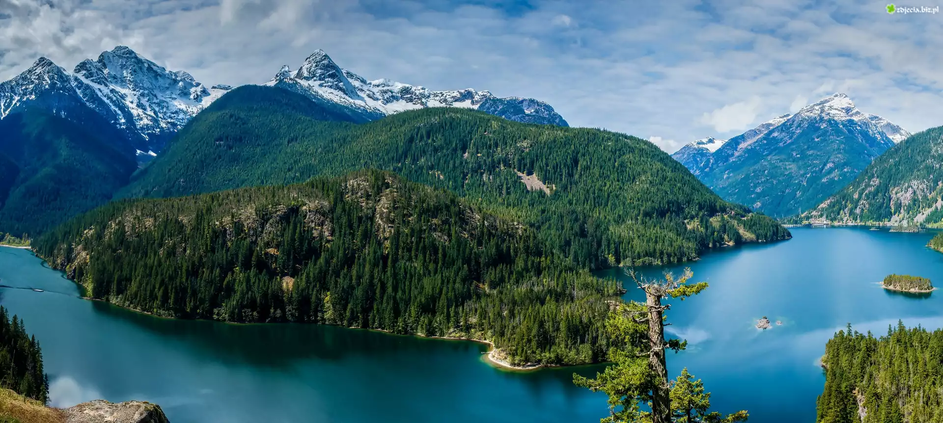 Zdjęcie Stany Zjednoczone, Stan Waszyngton, Park Narodowy Północnych Gór Kaskadowych, Jezioro Diablo Lake, Góry, Lasy, Panorama |