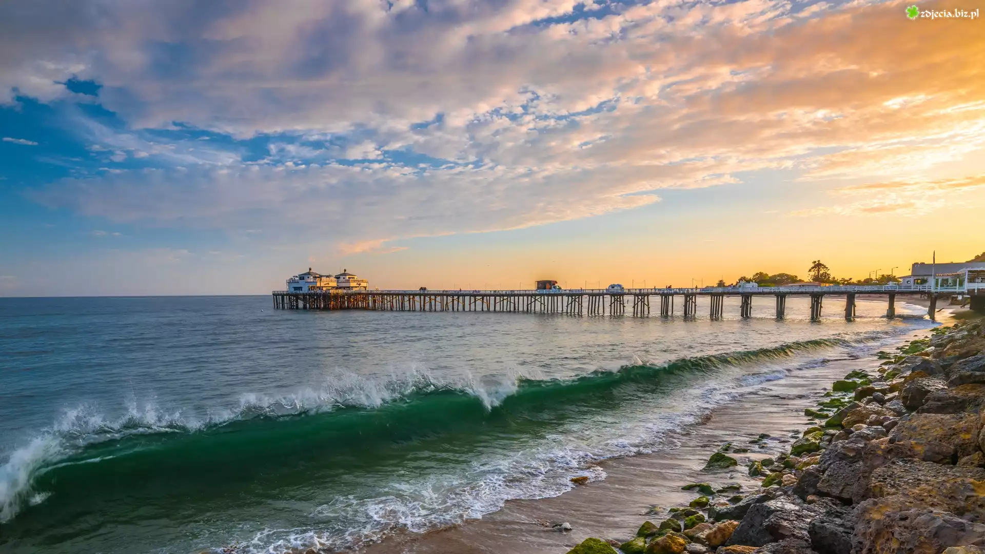Zdjęcie Stany Zjednoczone, Kalifornia, Malibu, Morze, Fale, Molo, Wybrzeże, Fale, Kamienie, Wschód słońca, Chmury |