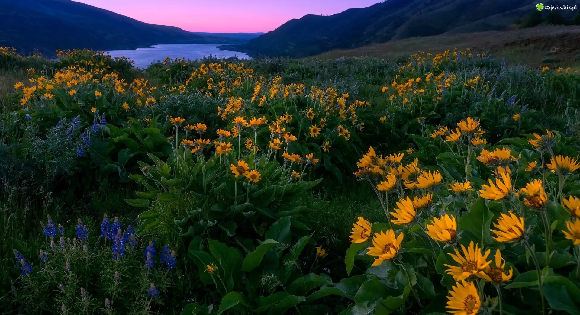 Zdjęcie Stany Zjednoczone, Stan Oregon, Rezerwat przyrody Columbia River Gorge, Wzgórza, Kwiaty, Góry, Rzeka |