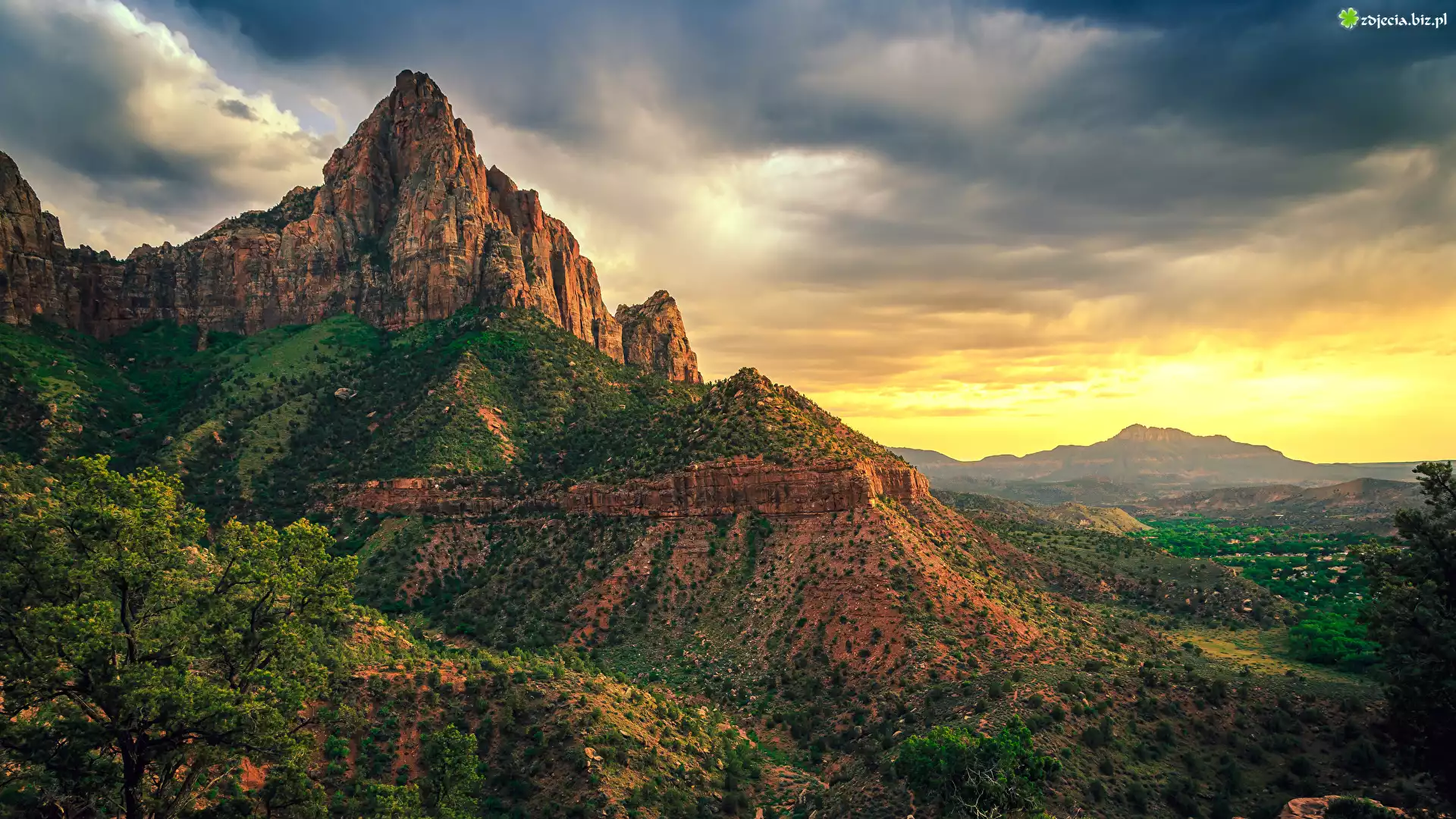 Zdjęcie Stany Zjednoczone, Stan Utah, Park Narodowy Zion, Góry, Drzewa, Krzewy, Wschód słońca, Chmury |