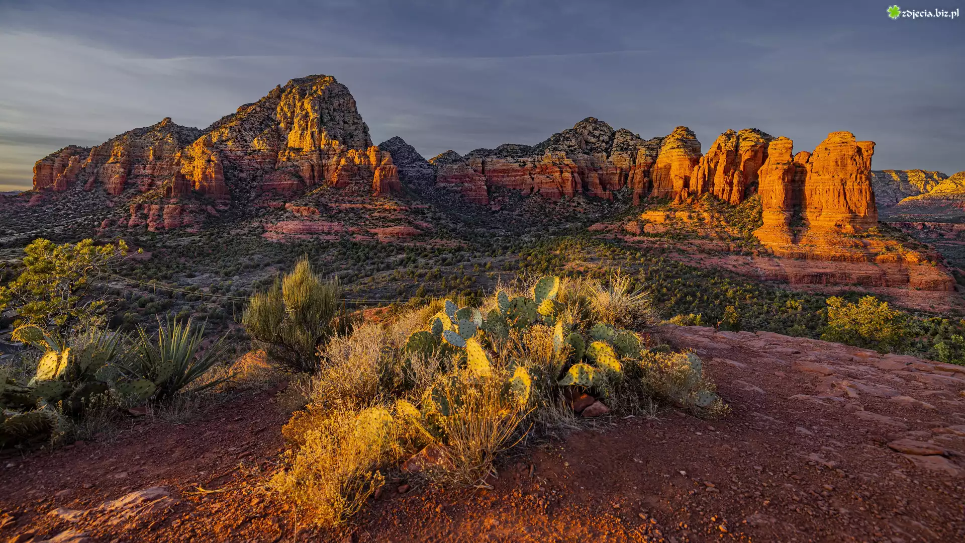 Zdjęcie Stany Zjednoczone, Arizona, Sedona, Góry, Skały, Kaktusy, Rośliny, Wschód słońca