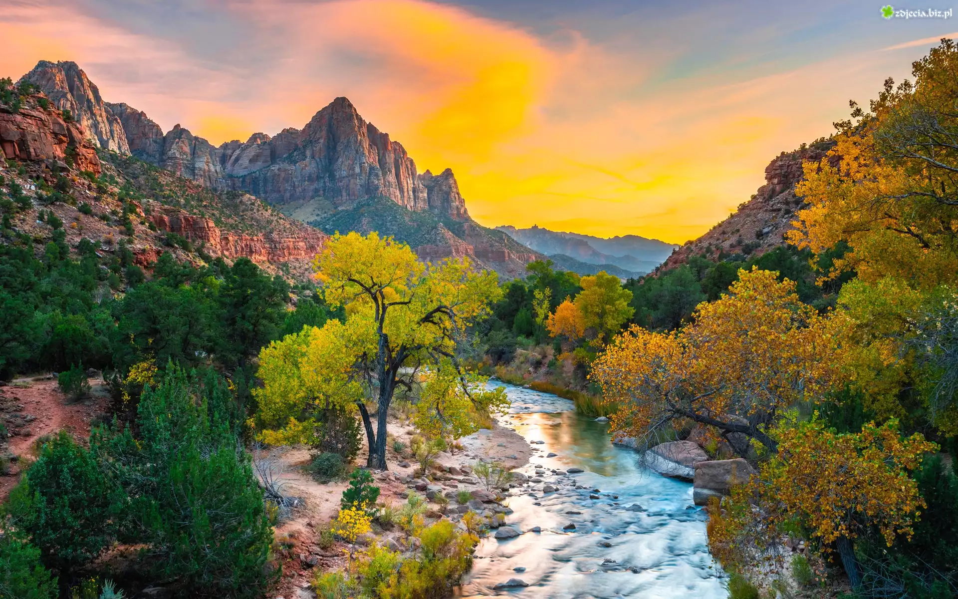 Zdjęcie Stany Zjednoczone, Stan Utah, Park Narodowy Zion, Góry Watchman, Rzeka Virgin River, Kamienie, Drzewa, Wschód słońca |