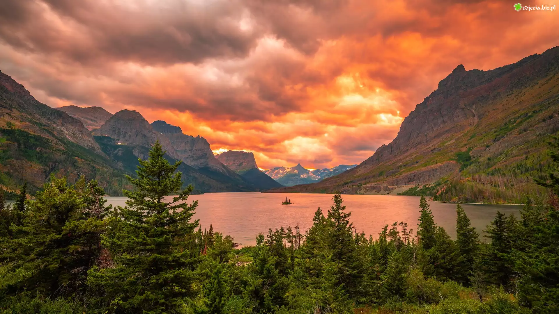 Zdjęcie Stany Zjednoczone, Stan Montana, Park Narodowy Glacier, Drzewa, Góry, Jezioro, Saint Mary Lake, Chmury, Zachód słońca |