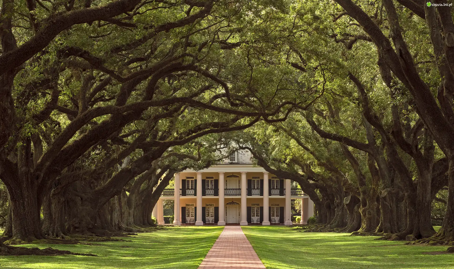 Zdjęcie Stany Zjednoczone, Stan Luizjana, Gmina Vacherie, Plantacja Oak Alley Plantation, Willa Oak Alley Plantation, Dom, Droga, Drzewa, Dęby |