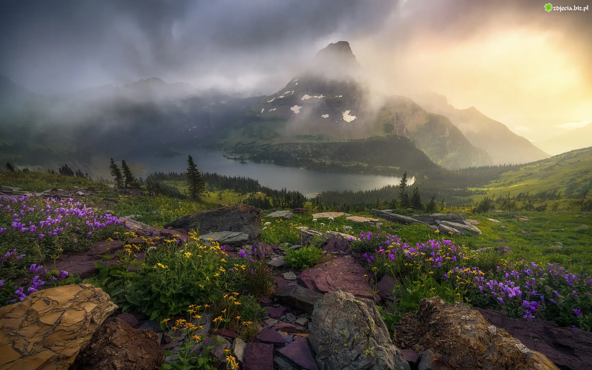 Zdjęcie Stany Zjednoczone, Stan Montana, Park Narodowy Glacier, Jezioro, Hidden Lake, Góry, Las, Drzewa, Kwiaty, Wschód słońca, Mgła, Chmury |