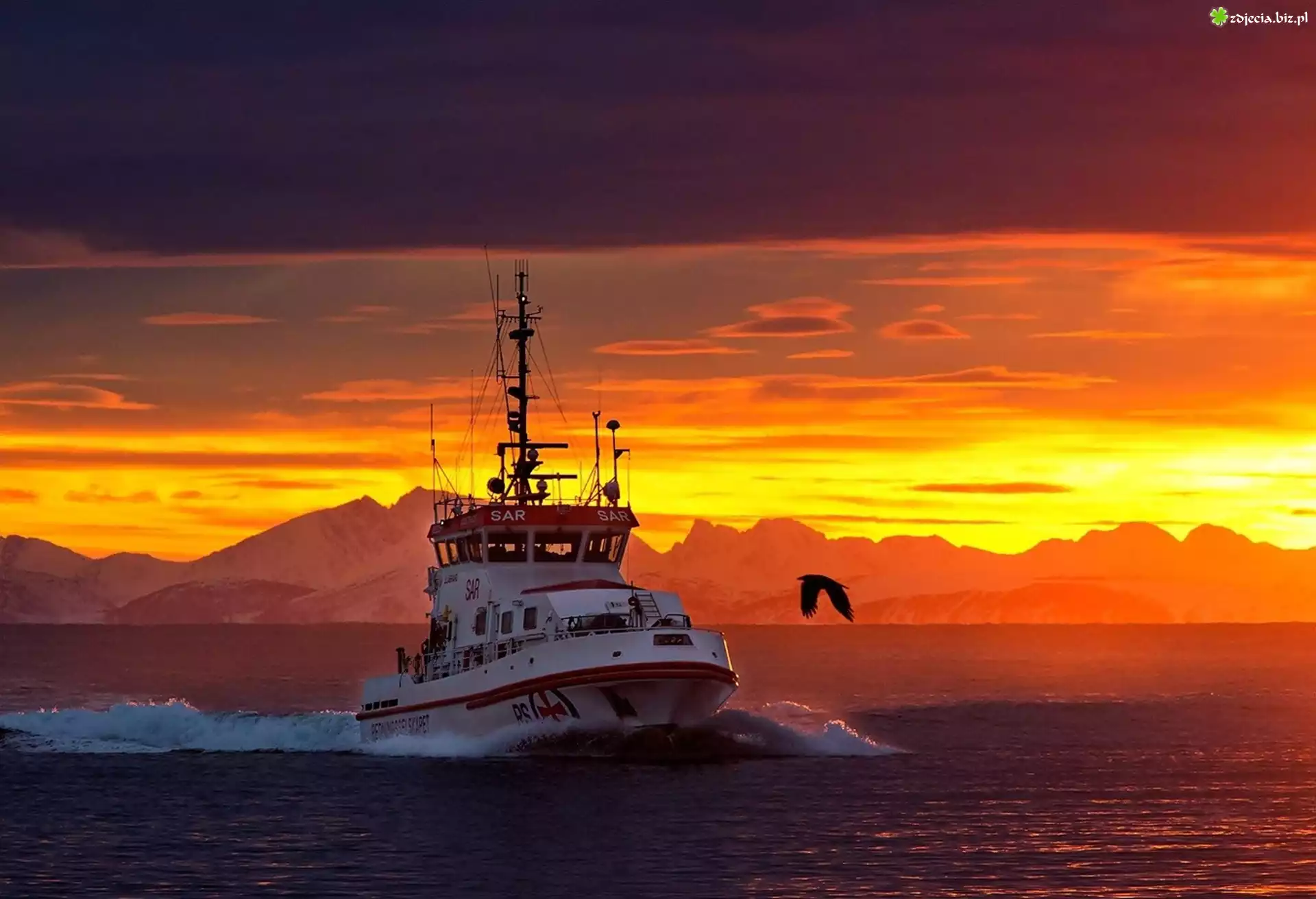 Zdjęcie Statek, Zachód, Słońca, Morze, Ptak