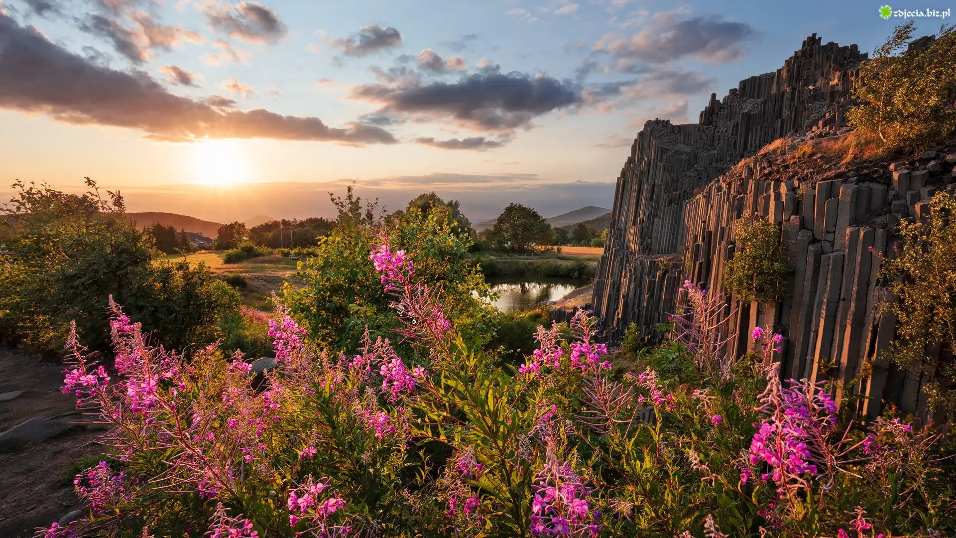 Zdjęcie Bazaltowe, Skały, Formacja, Panska Skala, Staw, Kwiaty, Wierzbówka kiprzyca, Kraj liberecki, Czechy |