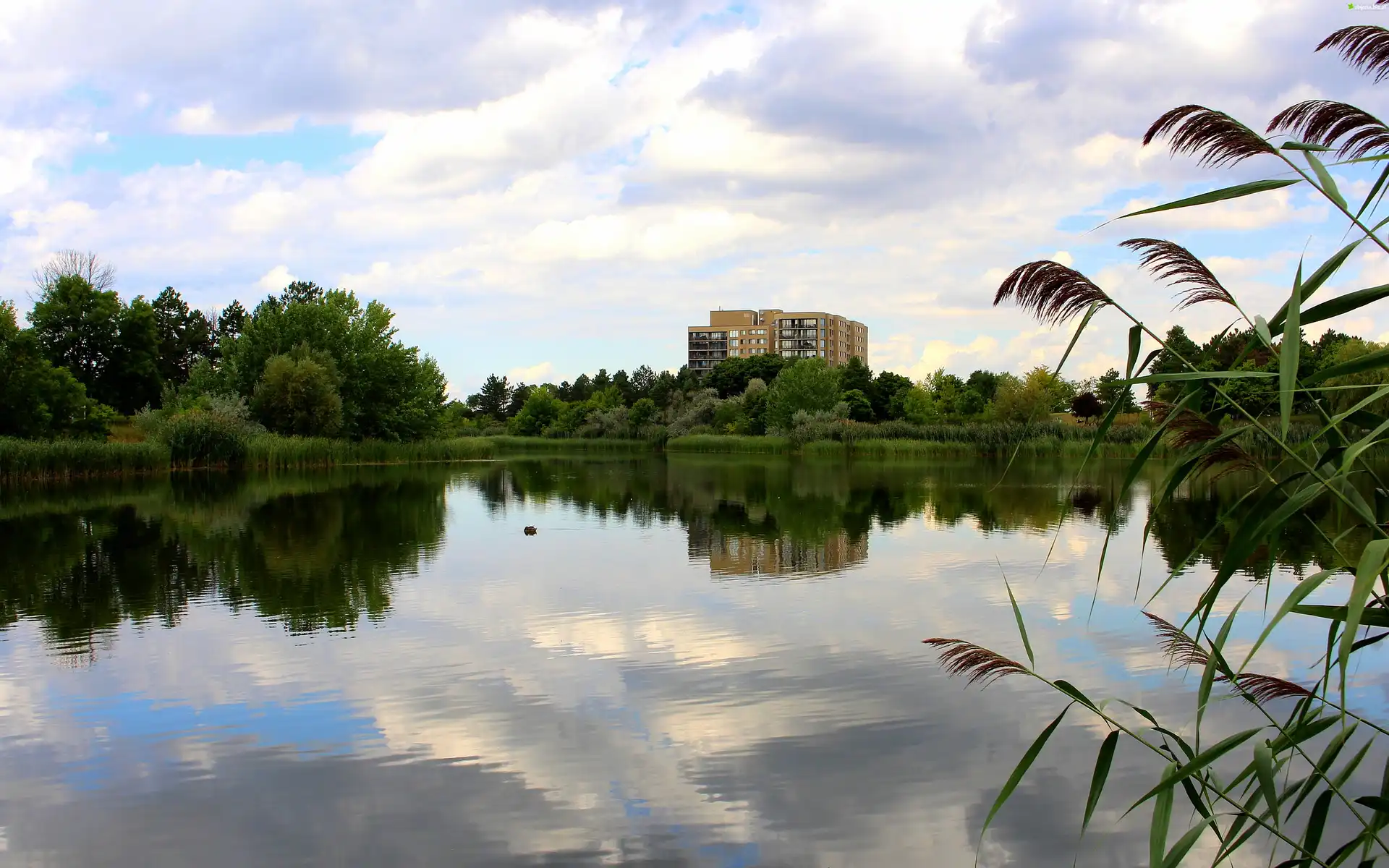 Zdjęcie, Staw, Domy, Drzewa, Odbicie, Niebo