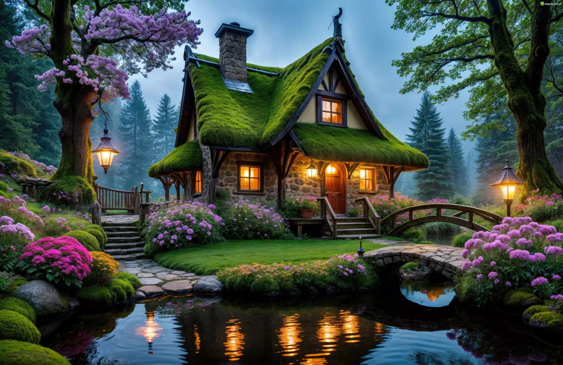 Zdjęcie, Oświetlony, Domek, Ogród, Staw, Lampy, Kwiaty, Grafika