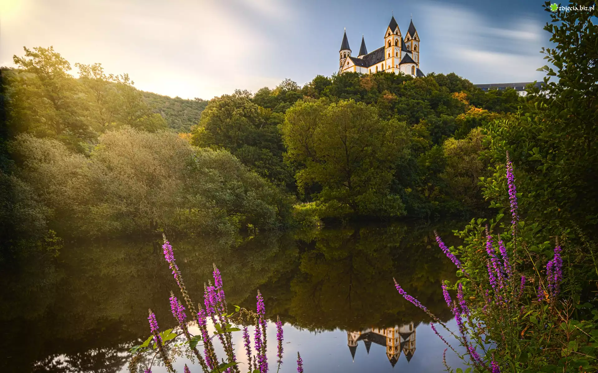Zdjęcie Wzgórze, Drzewa, Zamek, Staw, Odbicie, Fioletowe, Kwiaty