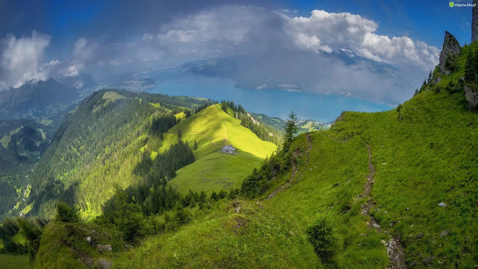 Zdjęcie Góry, Szczyty, Jezioro, Ścieżka, Lasy, Drzewa, Chmury, Nasłoneczniony, Stok