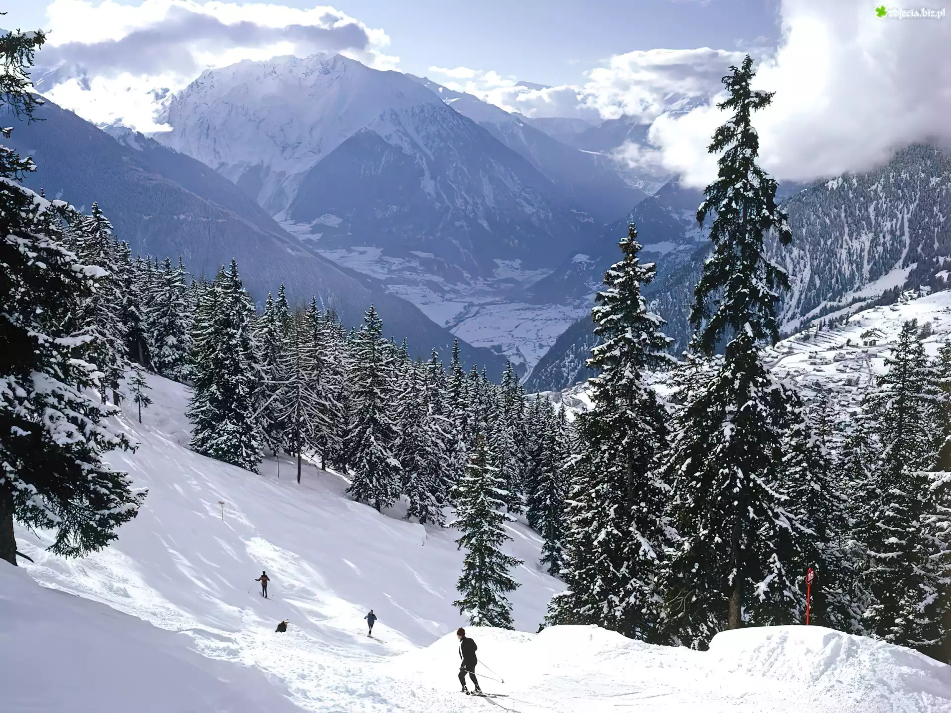 Zdjęcie Stok, Górski, Ośnieżone, Iglaki, Zima, Narciarze