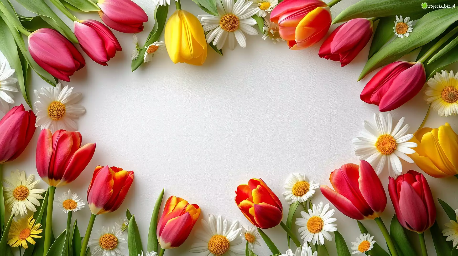 Zdjęcie Kolorowe, Kwiaty, Tulipany, Stokrotki, Białe, Tło