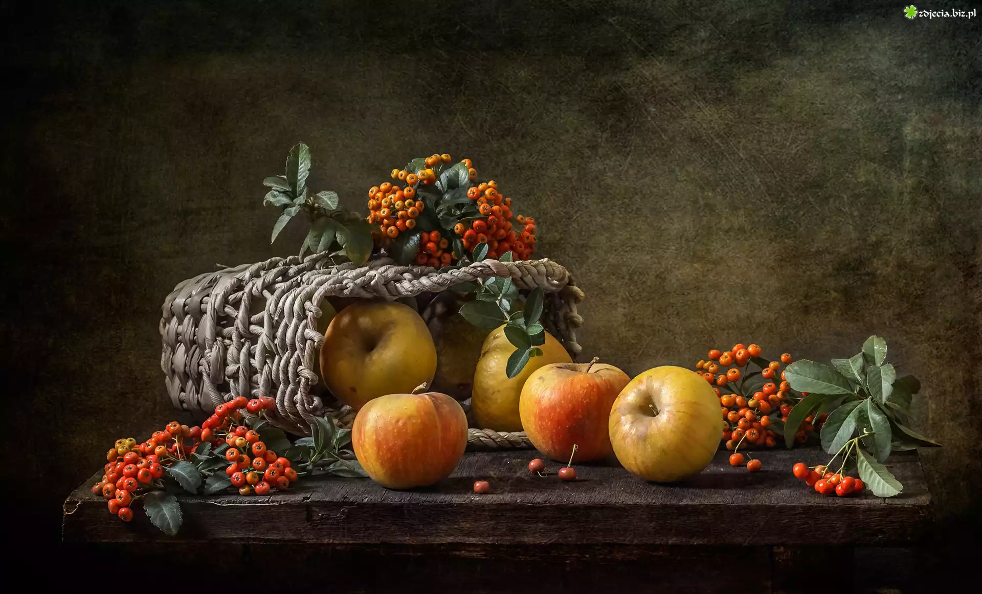 Zdjęcie Stół, Koszyk, Jabłka, Jarzębina