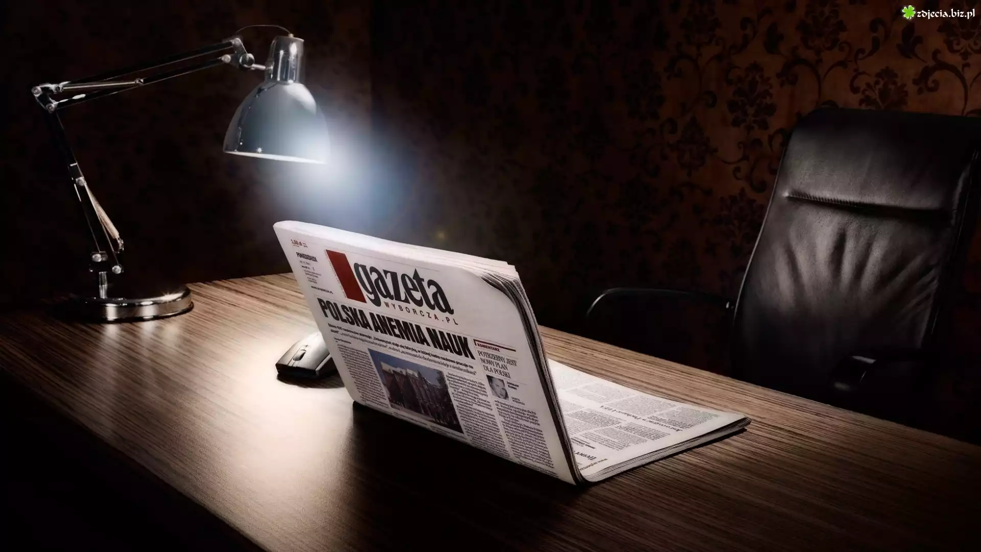 Zdjęcie Stół, Lampa, Fotel, Myszka, Gazeta