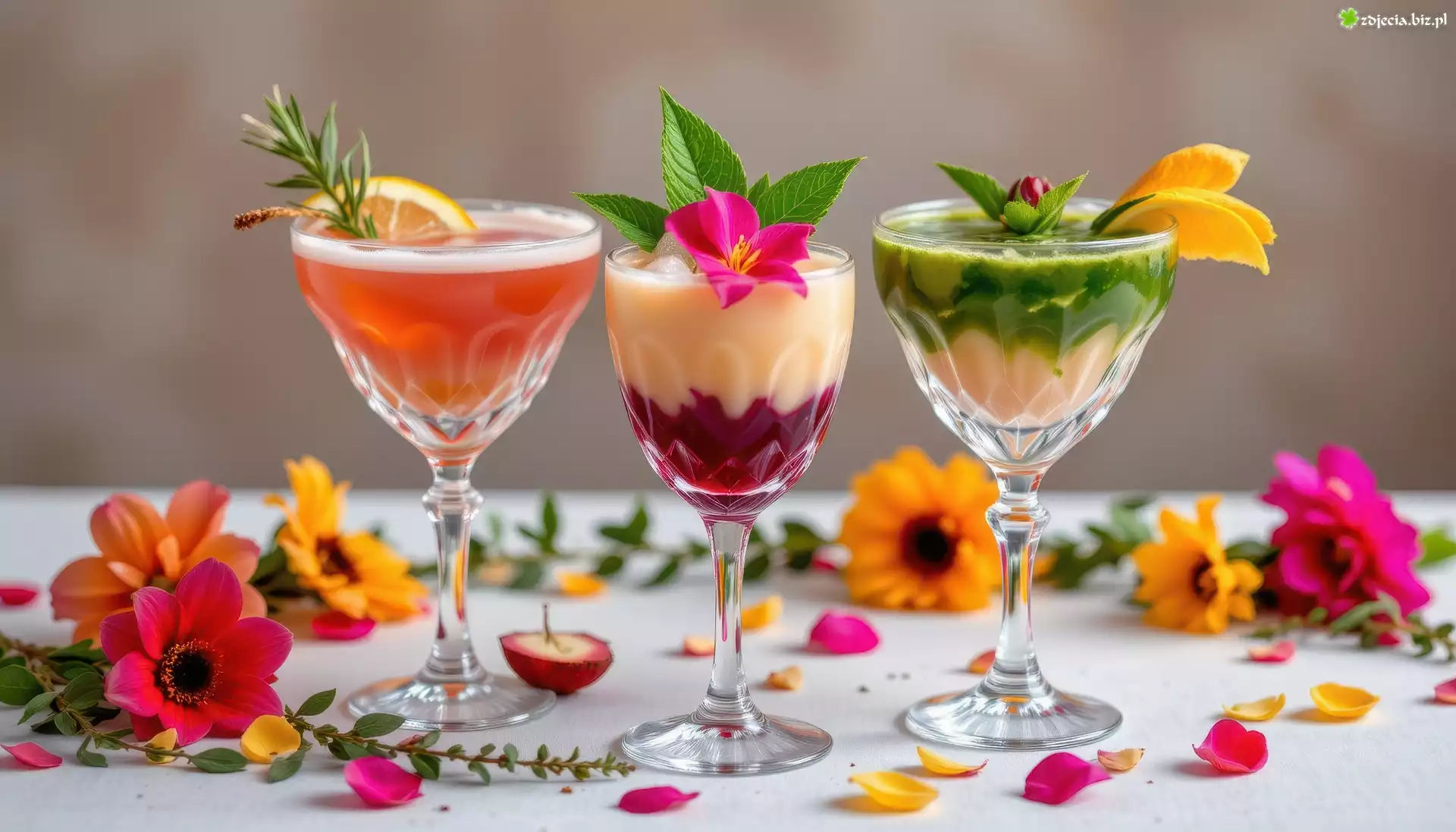 Zdjęcie Trzy, Drinki, Kwiaty, Stół