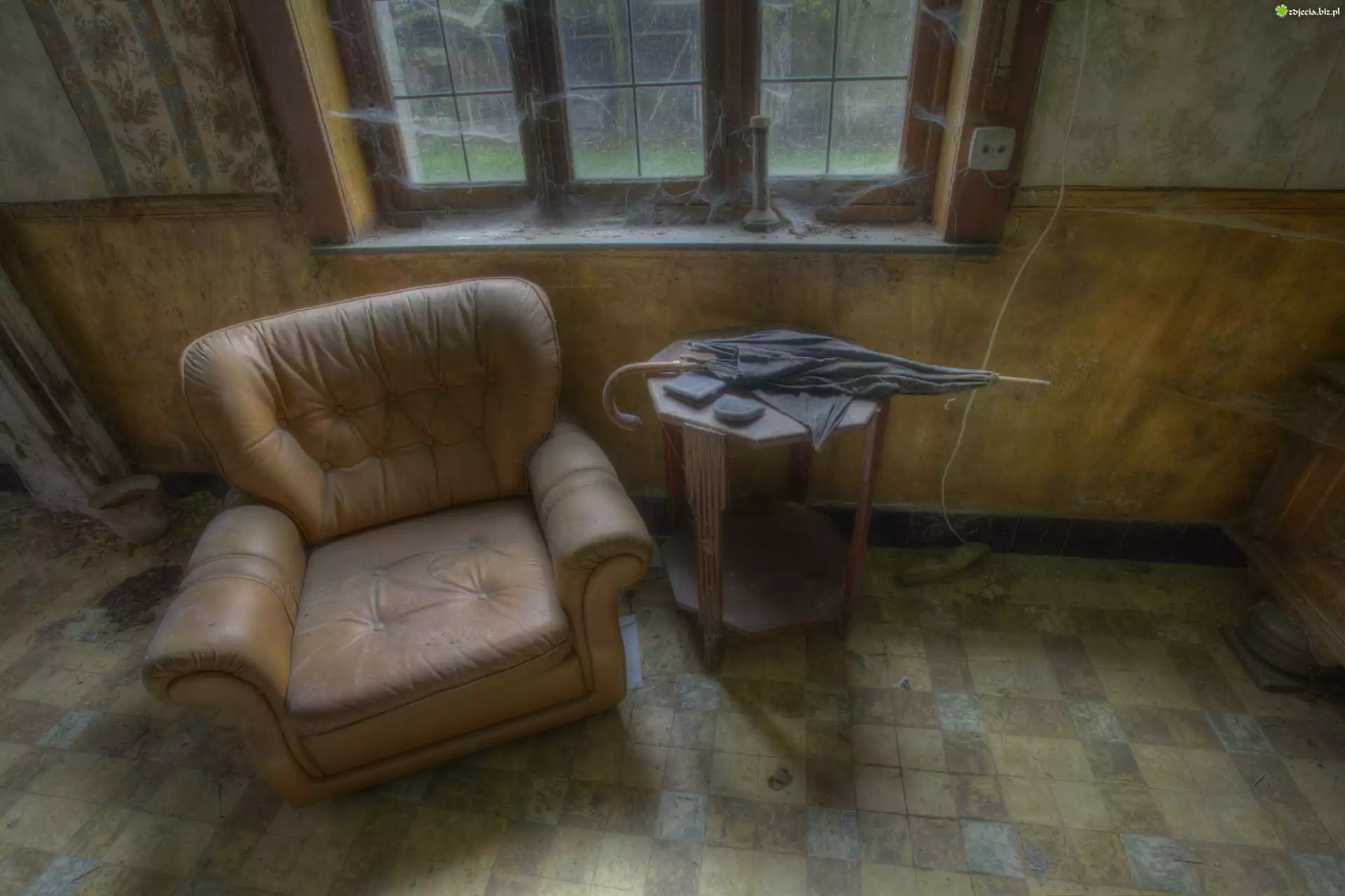 Zdjęcie, Zaniedbane, Pomieszczenie, Fotel, Stolik, Parasol