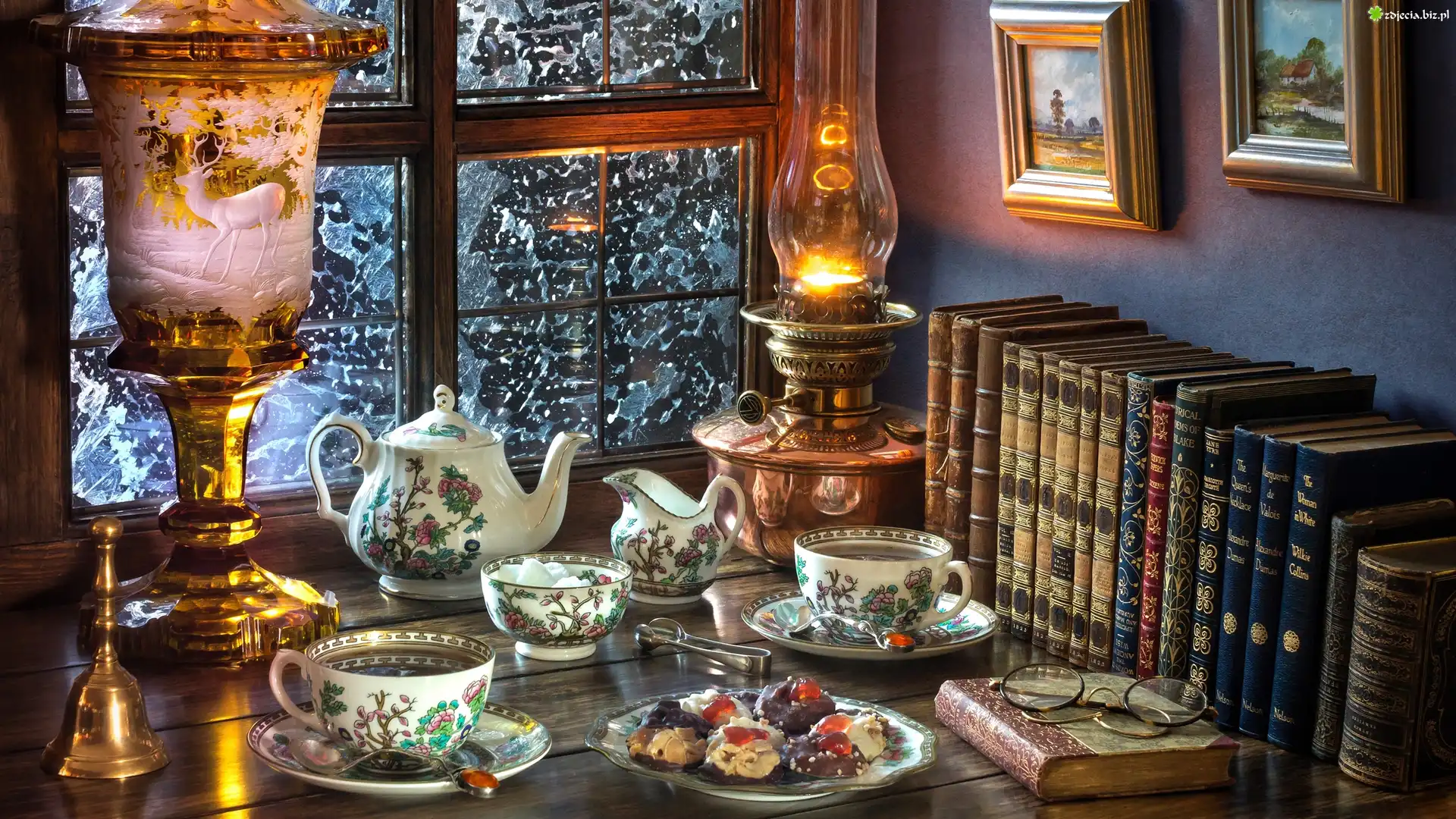 Zdjęcie Zastawa, Stołowa, Filiżanki, Kawa, Czajnik, Lampy, Książki, Okno