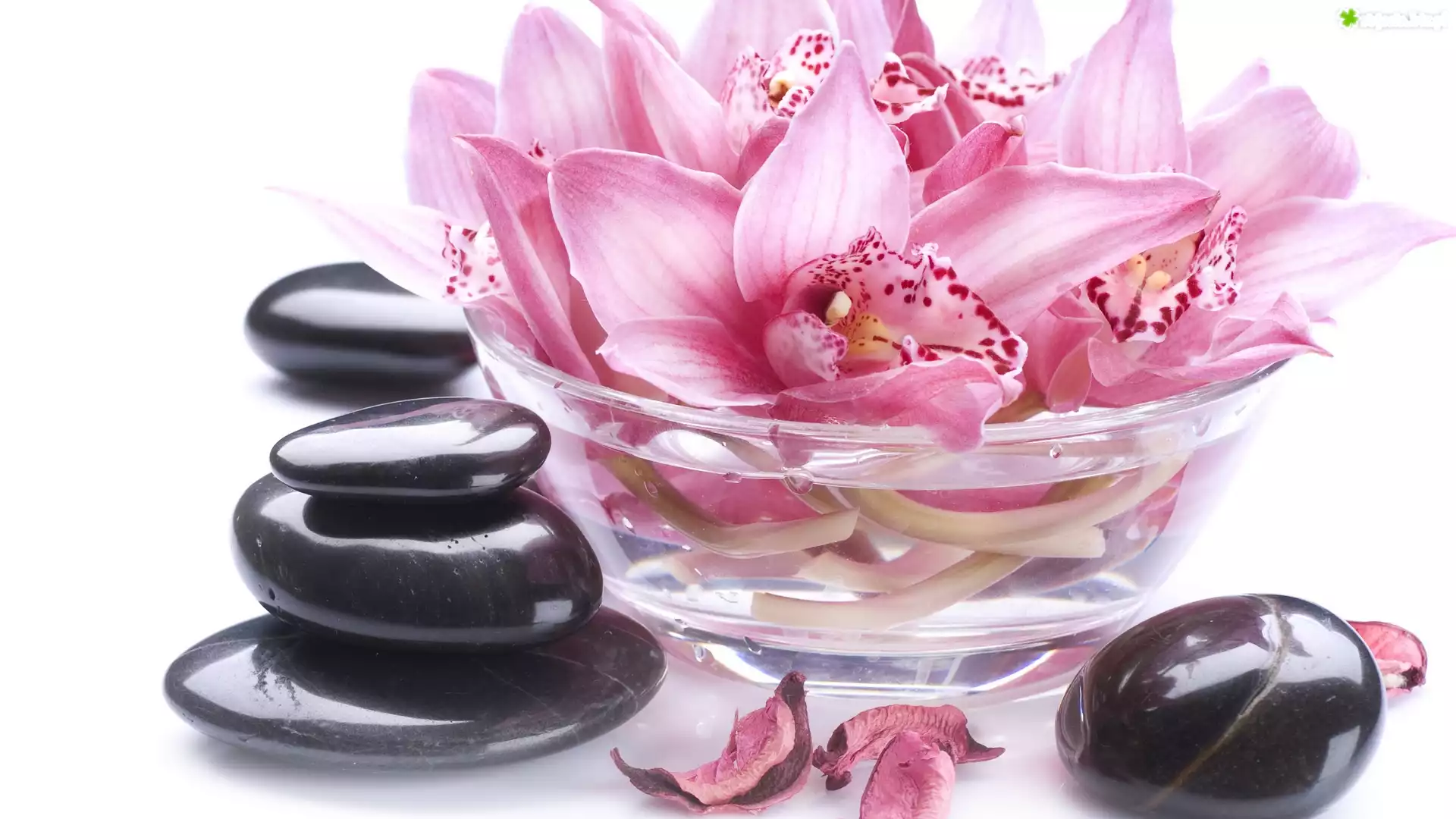 Zdjęcie Szklane, Naczynie, Kwiaty, Storczyki, Czarne, Kamienie