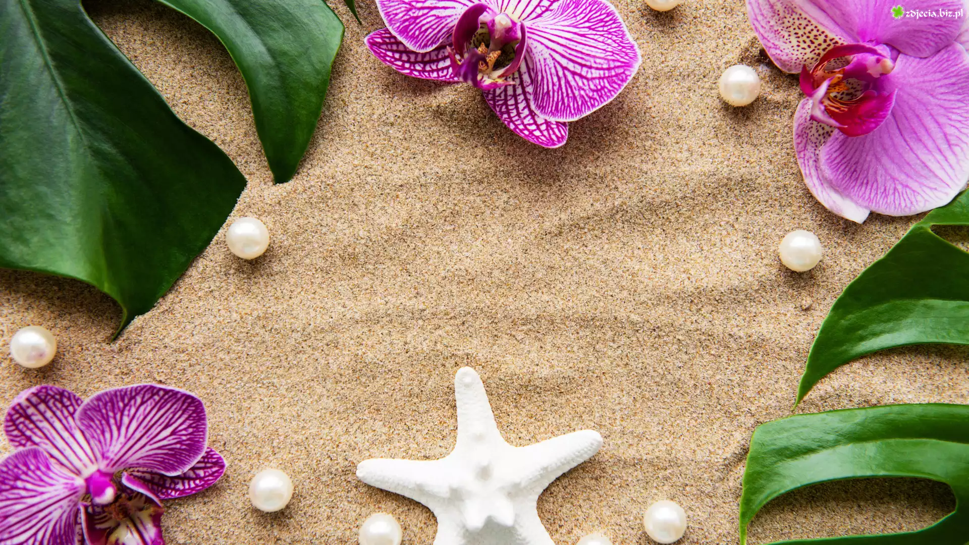 Zdjęcie Piasek, Liście, Kwiaty, Storczyki, Perły, Rozgwiazda, Kompozycja