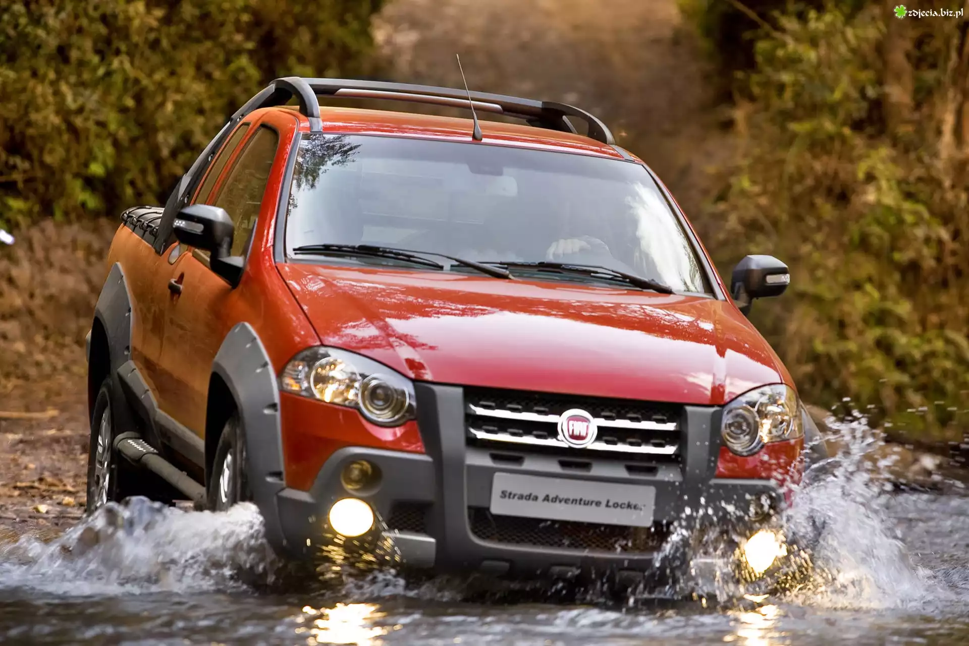 Przeprawa, Fiat Strada, Offroad Tył, Fiat Strada, Paka Budynek, Drzewa, Droga, Fiat Strada Fiat Strada, Szyberdach, Zalew Fiat Strada, Rzeka Fiat Strada, Adventure Pomarańczowy, Fiat Strada, Salon Biały, Fiat Strada, Klapa, Paki