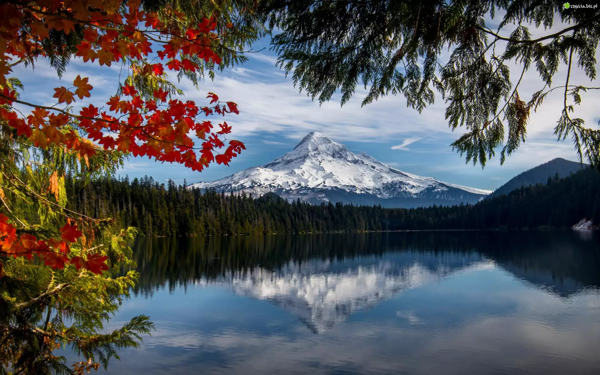 Zdjęcie Stany Zjednoczone, Stan Oregon, Góra, Stratowulkan Mount Hood, Jezioro Lost Lake, Drzewa