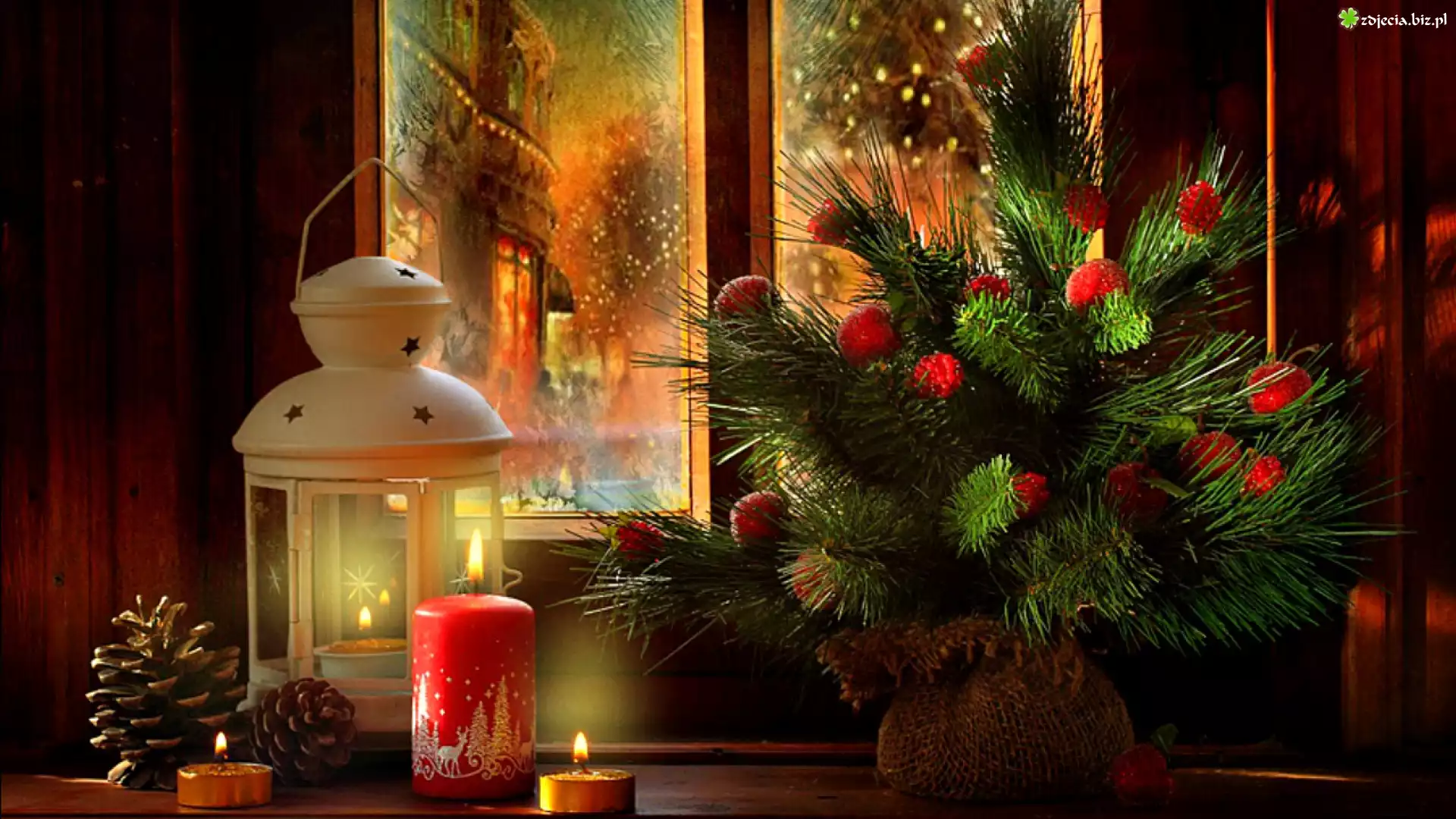 Zdjęcie Stroik, Świeca, Okno, Boże Narodzenie, Świąteczne, Kompozycja, Lampion