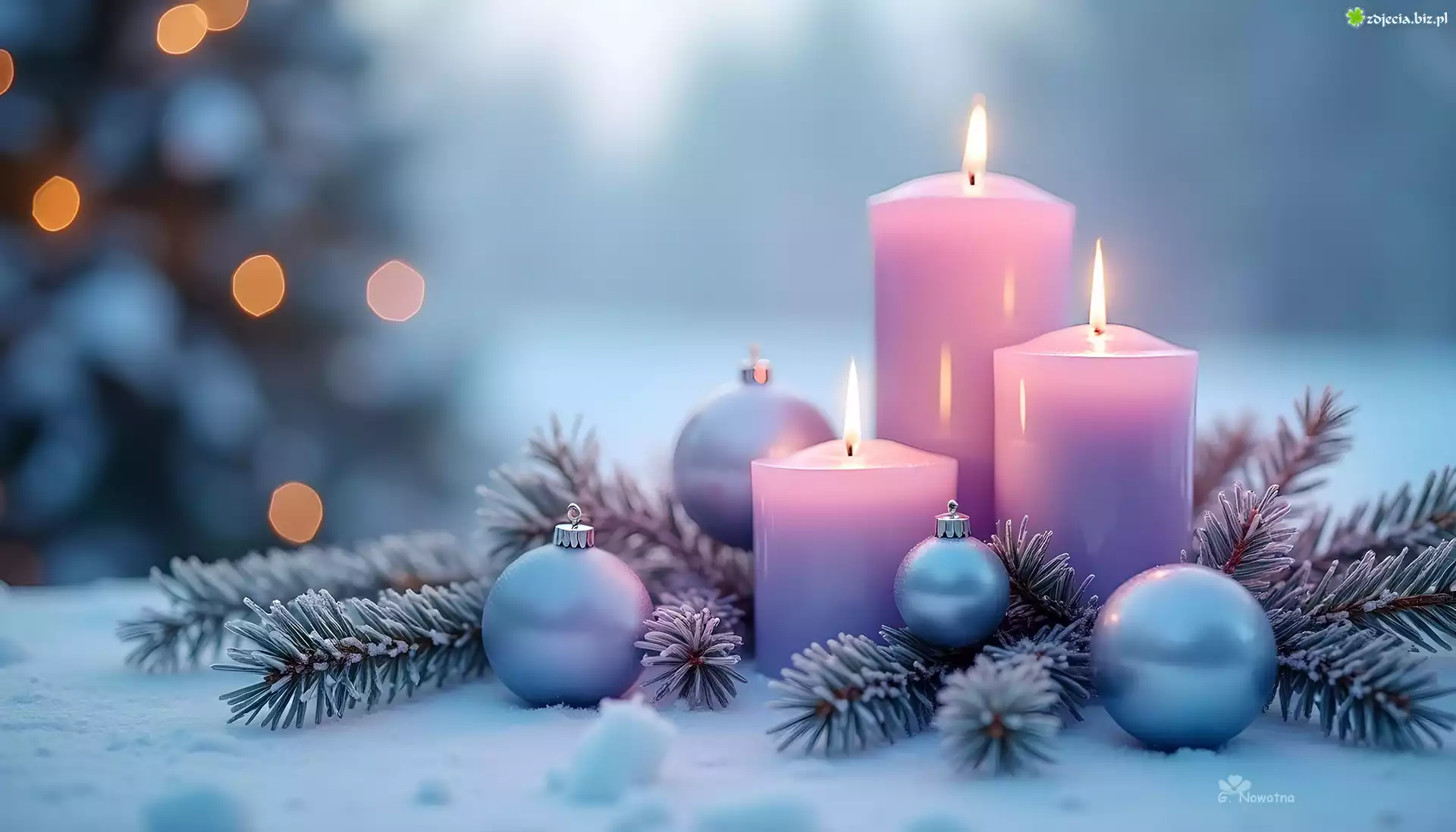 Zdjęcie Stroik, Świece, Bombki, Boże Narodzenie, Świerk, Śnieg, Zima, Grafika