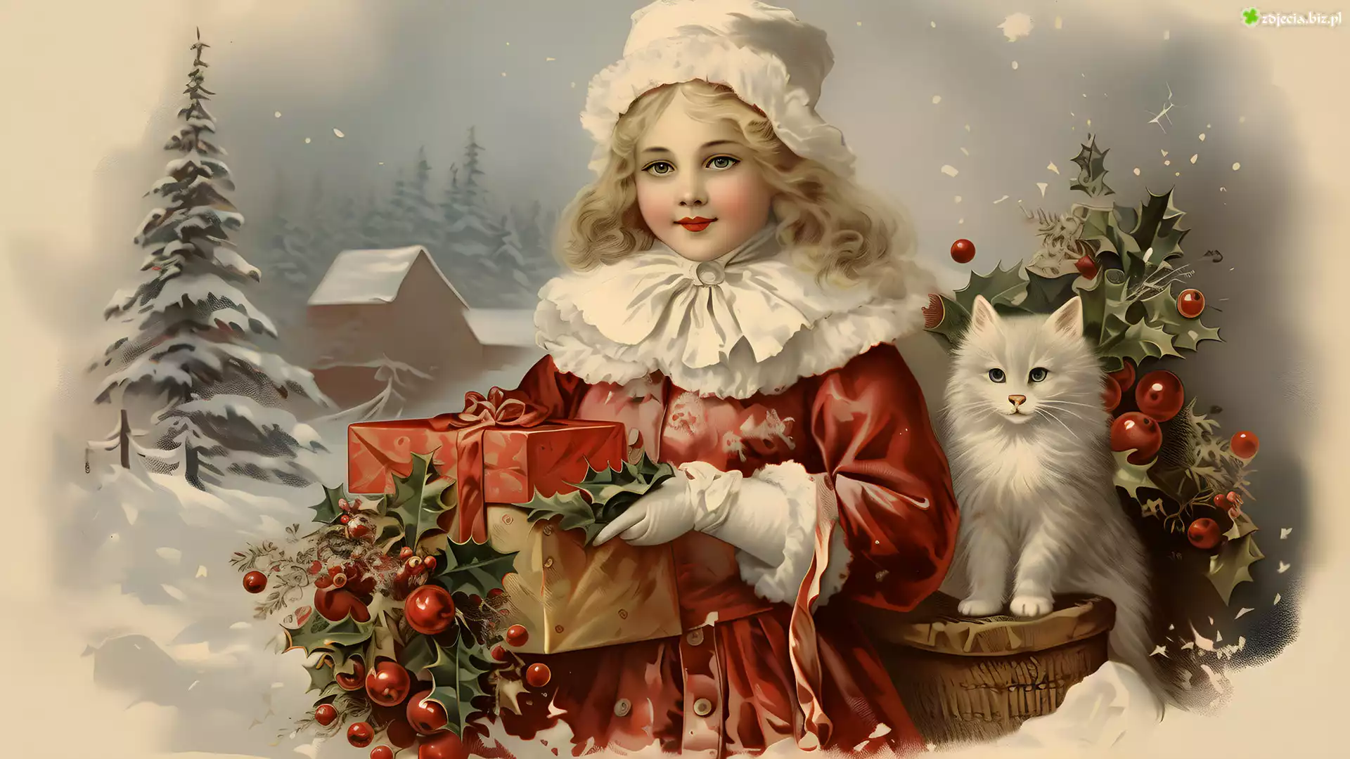 Zdjęcie Grafika, Zima, Boże Narodzenie, Dziewczynka, Blondynka, Strój, Czapka, Prezent, Biały, Kot |