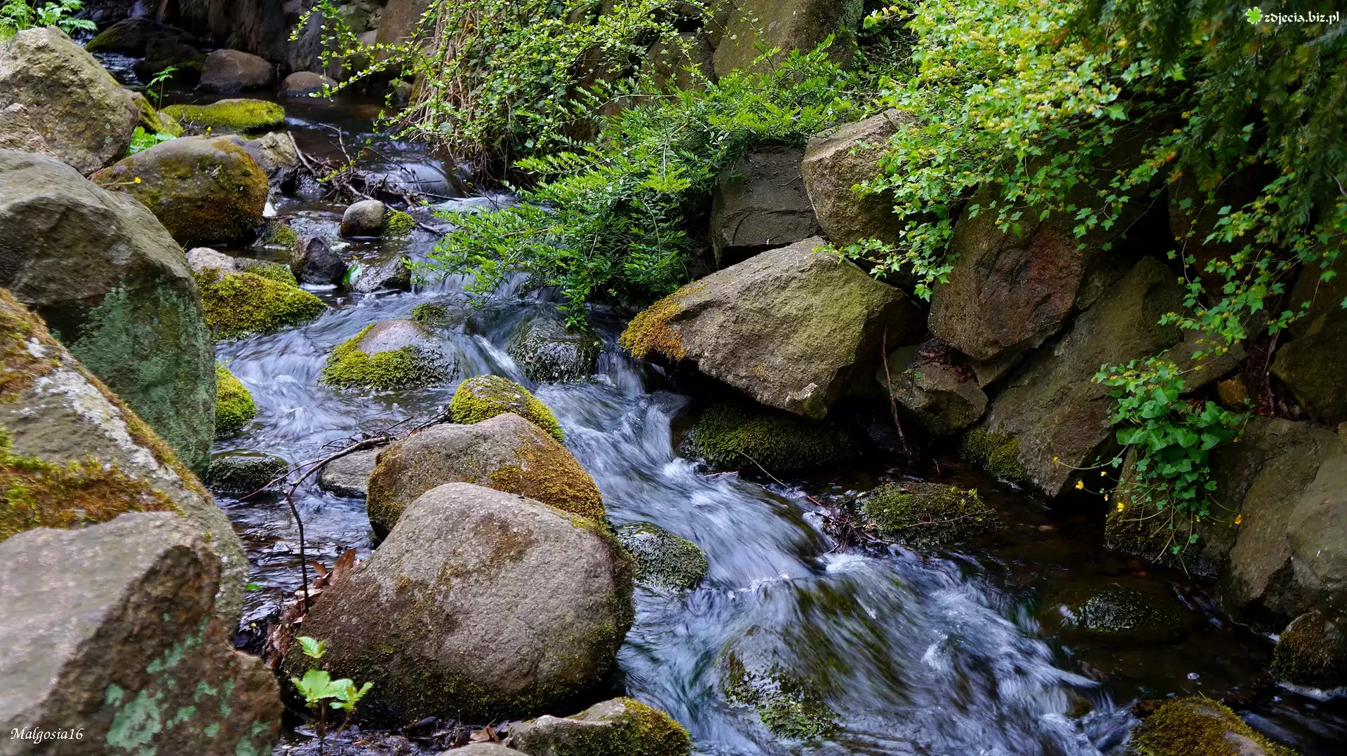 Zdjęcie Strumień, Woda, Kamienie, Mech, Rośliny
