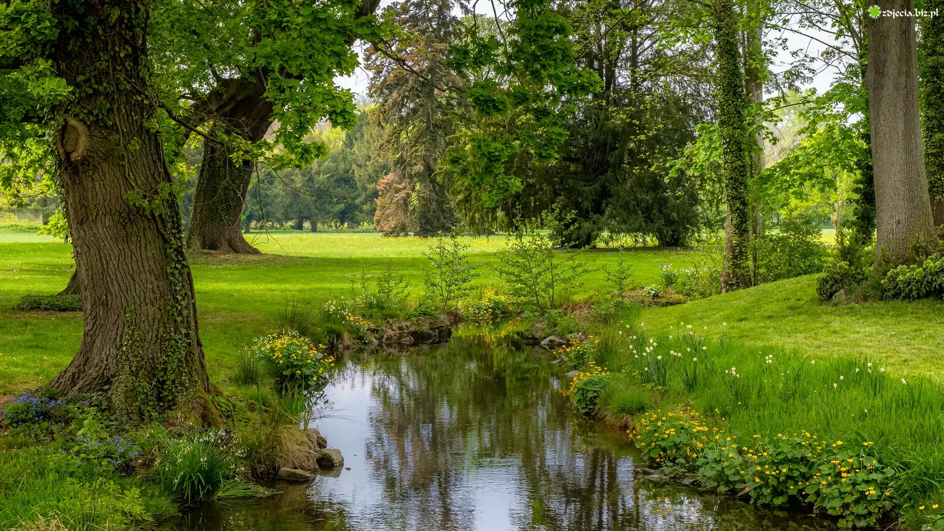 Zdjęcie Rzeczka, Strumuk, Drzewa, Kwiaty, Wiosna