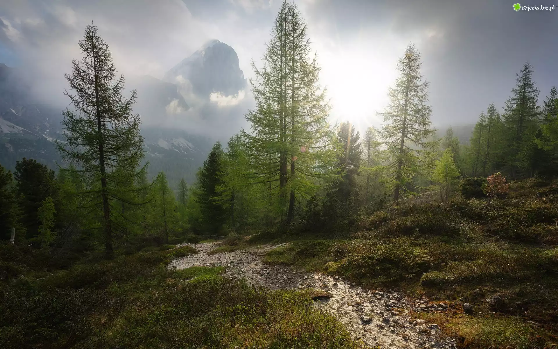 Zdjęcie Las, Drzewa, Kamienie, Strumyk, Góry, Mgła, Poranek