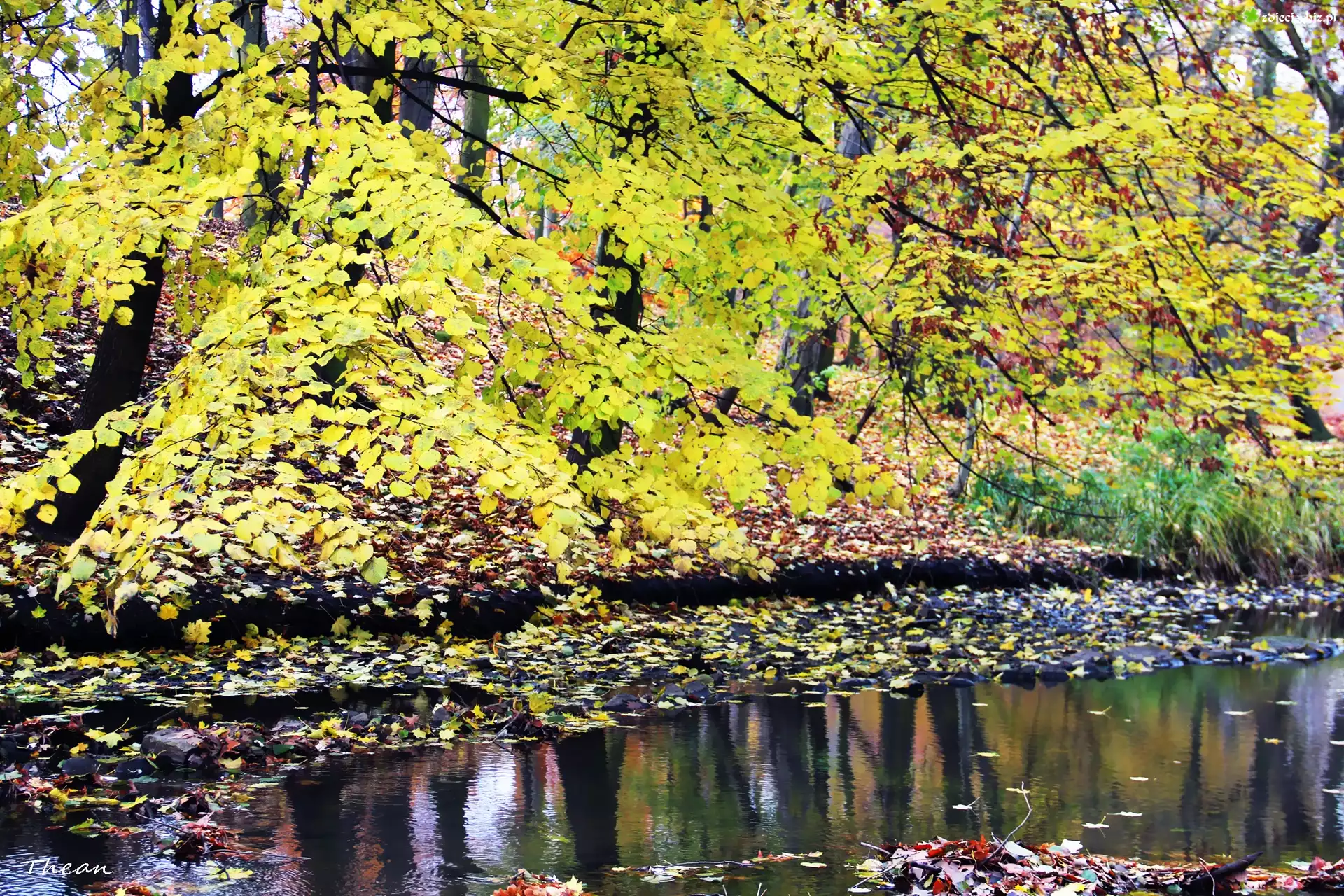 Zdjęcie Strumyk, Odbicie, Żółte, Liście, Jesień