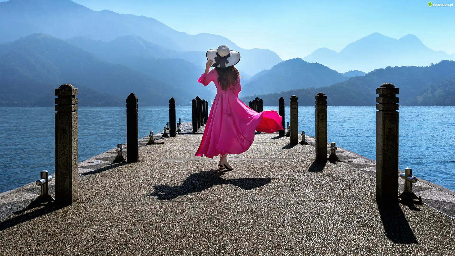 Zdjęcie Dziewczyna, Biały, Kapelusz, Różowa, Sukienka, Spacer, Pomost, Jezioro, Sun Moon Lake, Yuchi Township, Tajlandia |