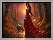Zdjęcie Wilk, Kobieta, Czerwona, Suknia, Latarnia, Las, Grafika