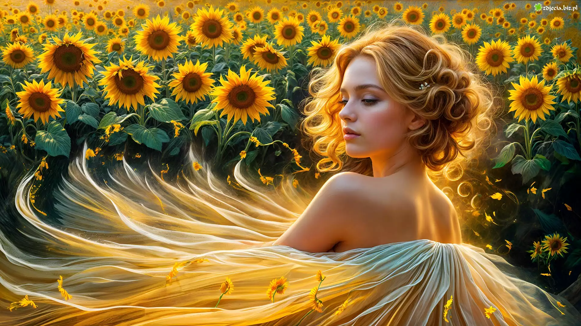 Zdjęcie Kobieta, Suknia, Słoneczniki, Lato, Grafika