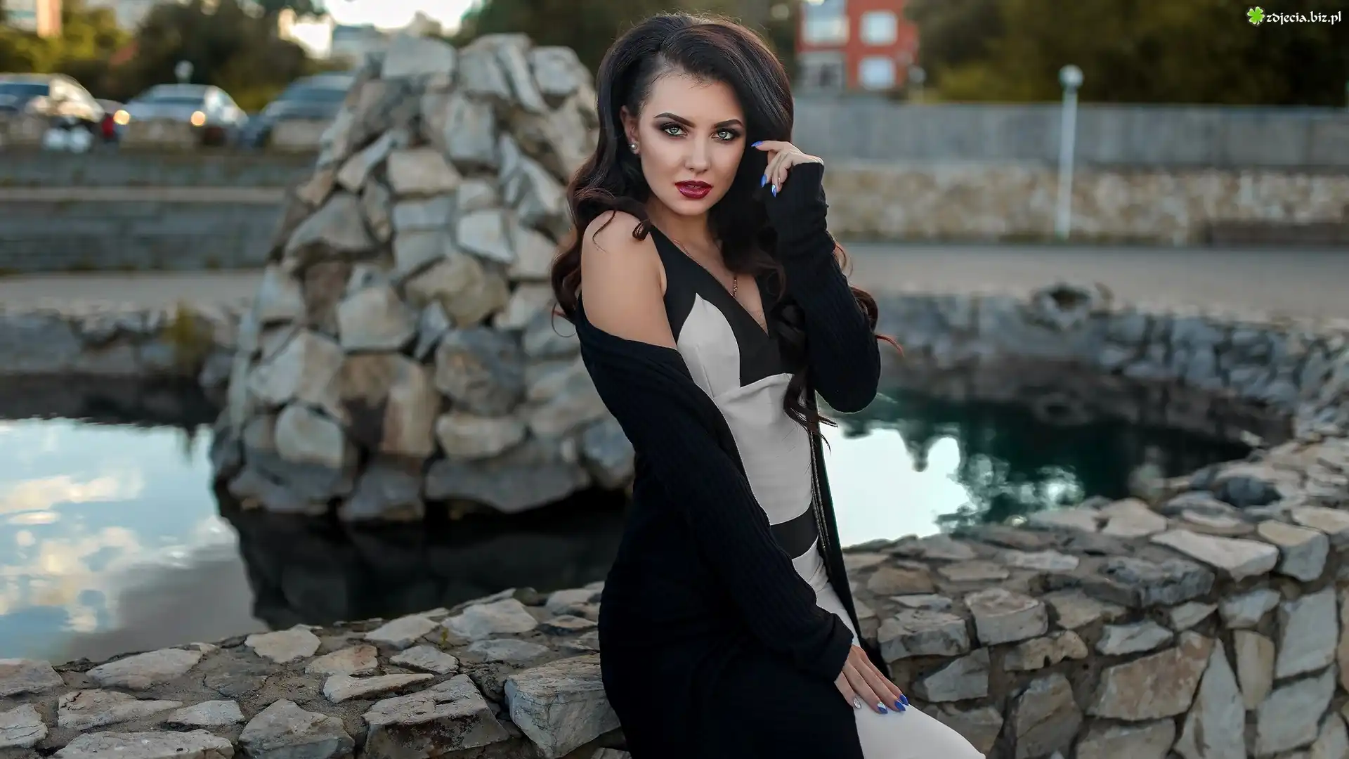 Zdjęcie Kobieta, Sweter, Sukienka, Niebieskie, Paznokcie, Kamienny, Murek