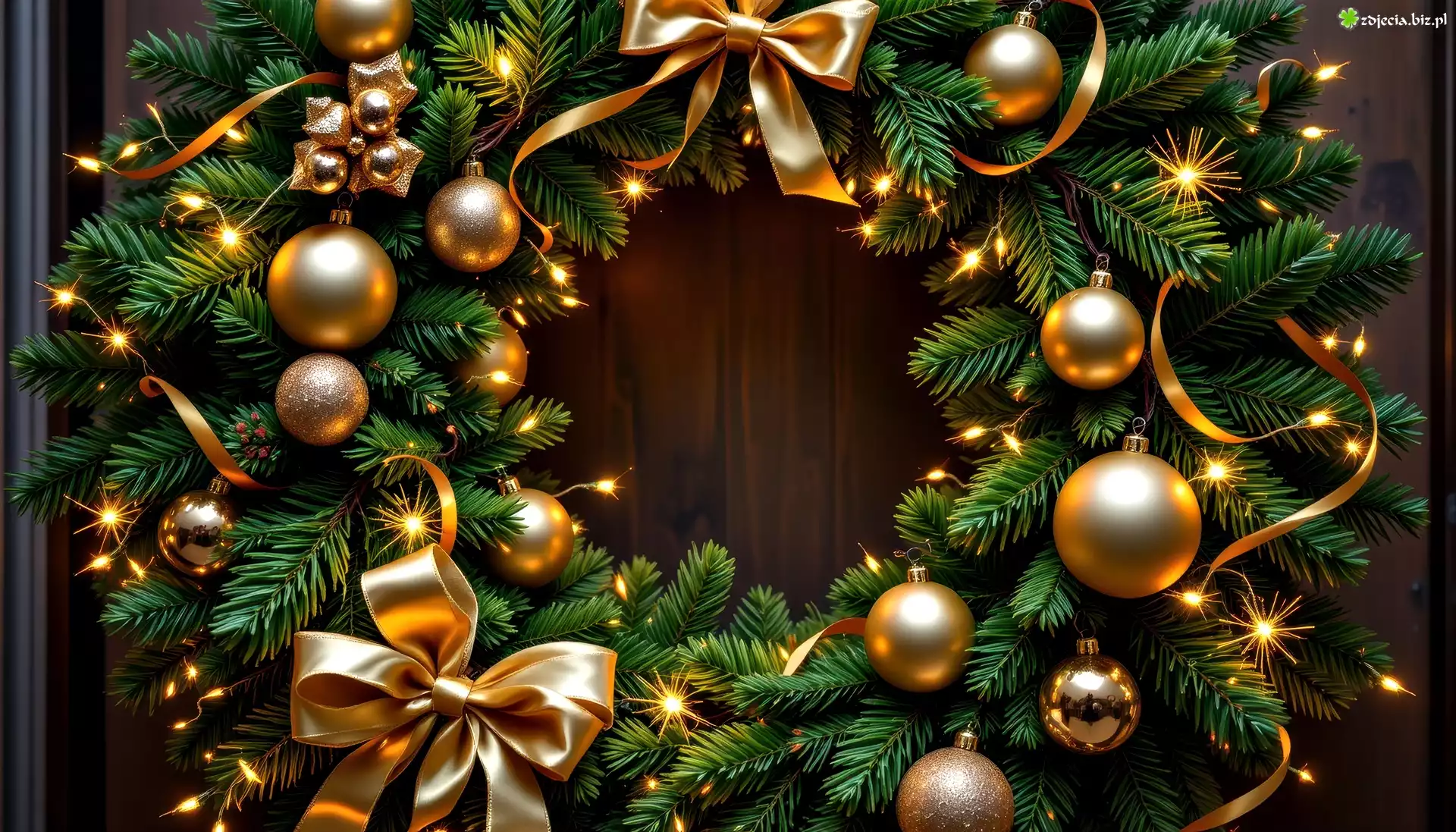 Zdjęcie Świąteczny, Wianek, Bombki, Złote, Kokardy, Boże Narodzenie, Grafika AI