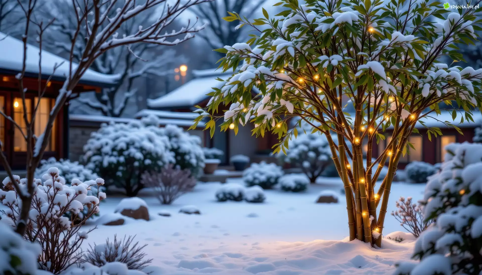 Zdjęcie, Zima, Ogród, Drzewko, Światełka, Dom, Grafika AI