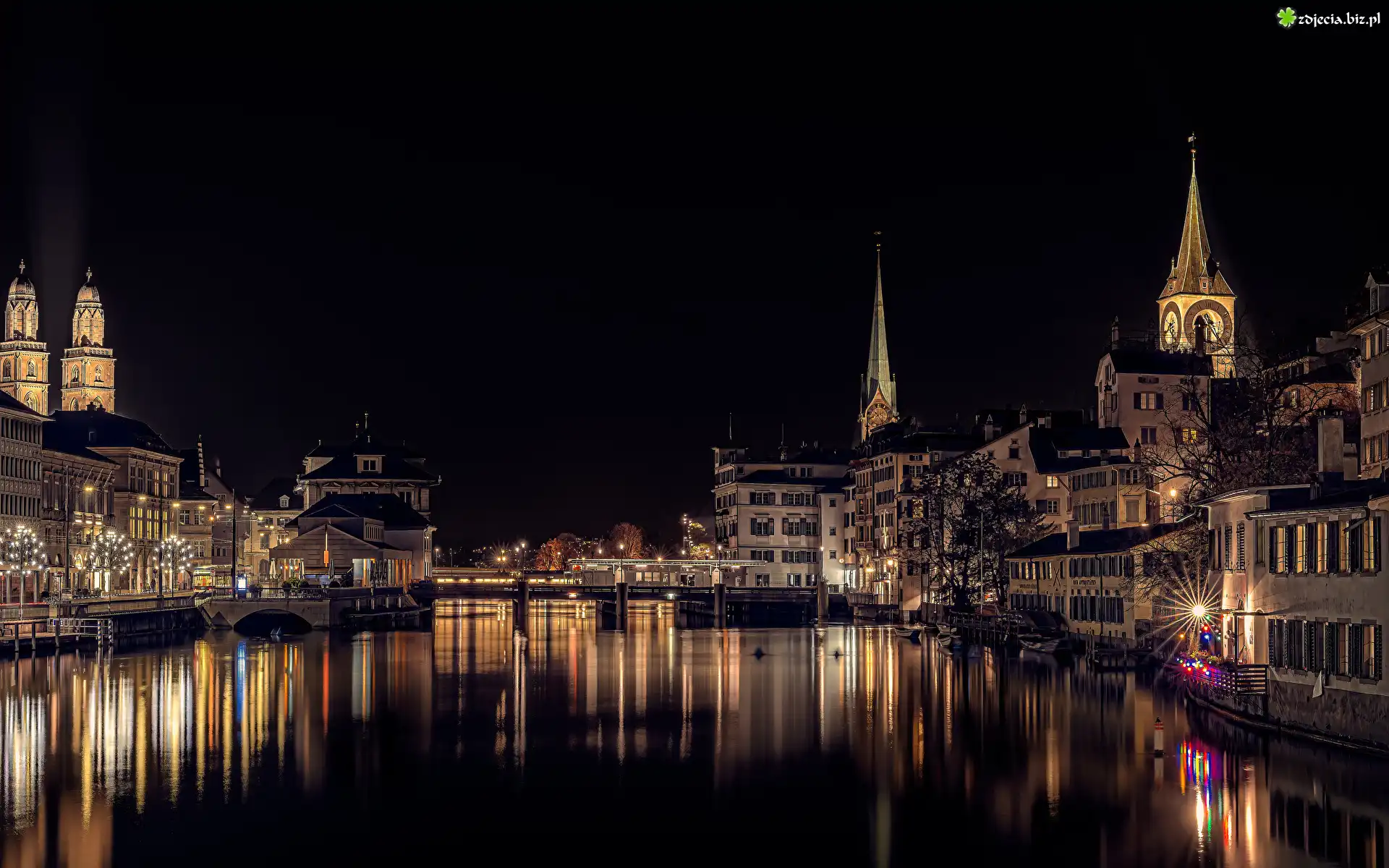 Zdjęcie Szwajcaria, Zurych, Rzeka Limmat, Most, Domy, Noc, Światła