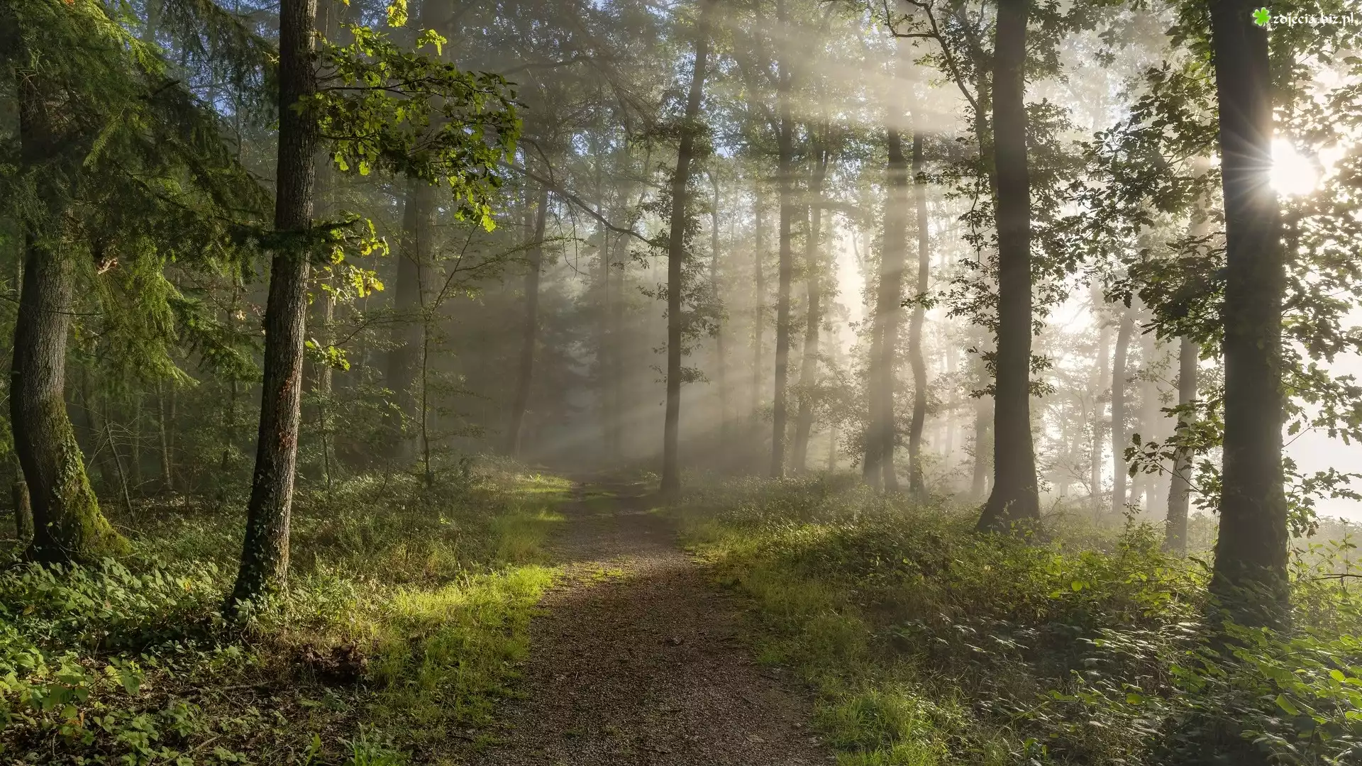 Zdjęcie Las, Droga, Przebijające światło, Słońce, Drzewa