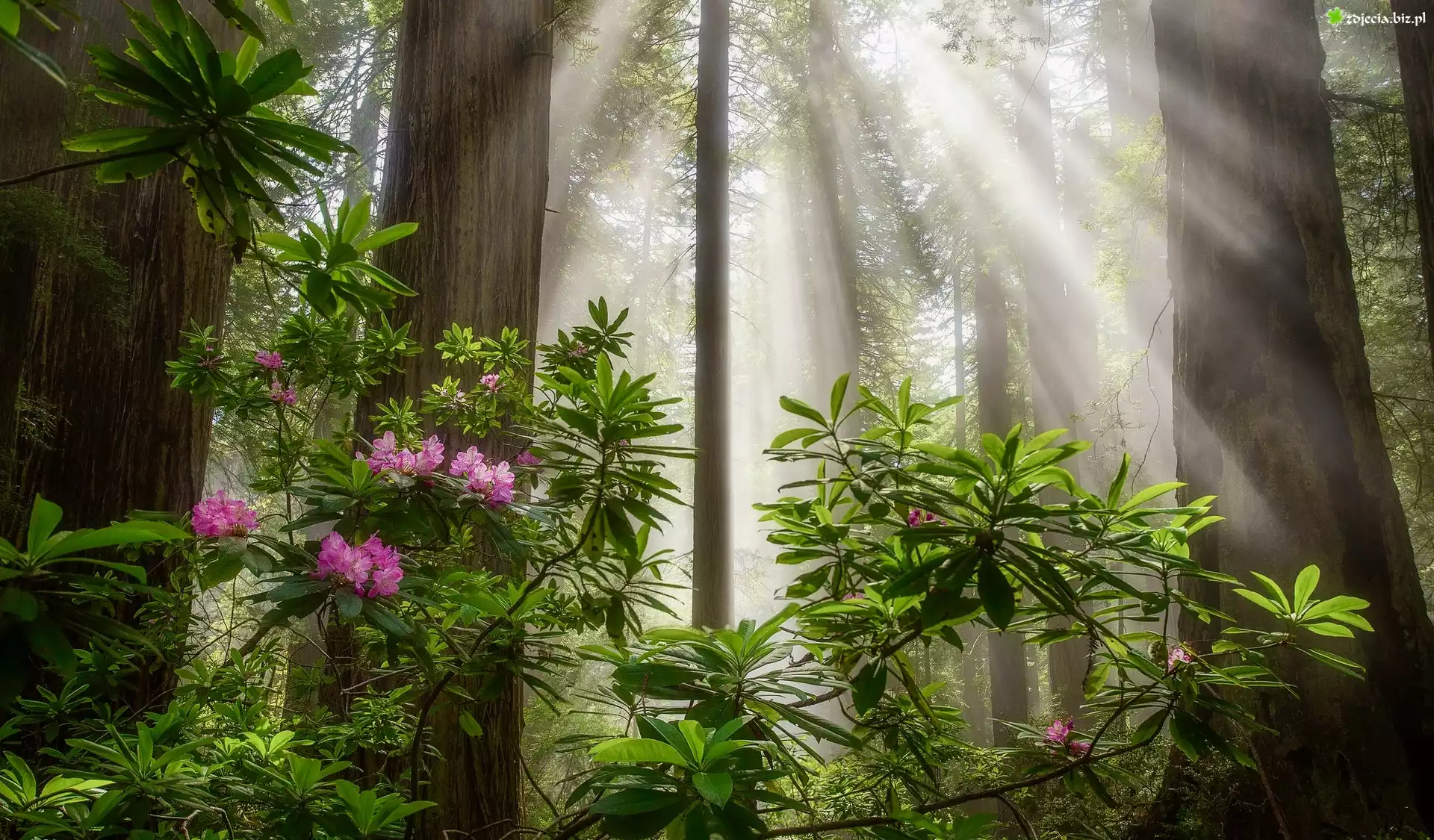 Zdjęcie Stany Zjednoczone, Kalifornia, Park Narodowy Redwood, Drzewa, Sekwoje, Przebijające światło, Różanecznik, Kwiaty |