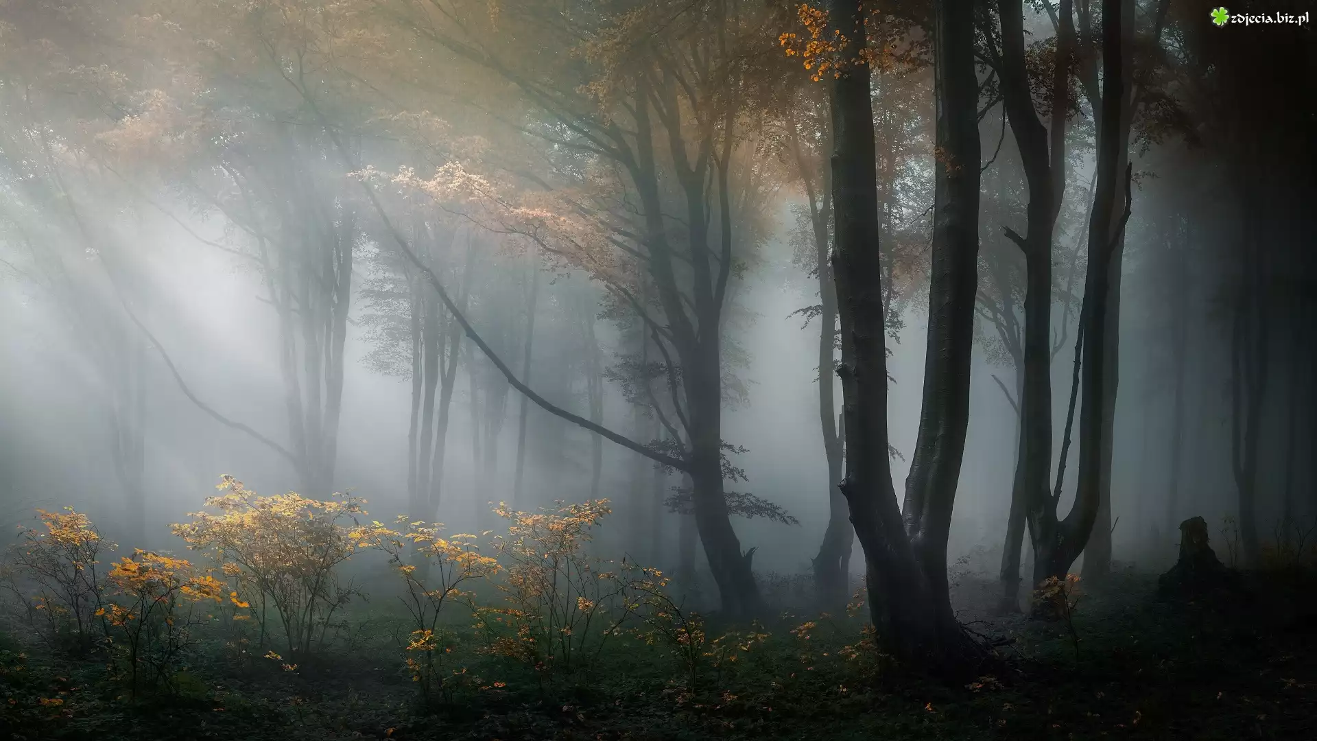 Zdjęcie Bułgaria, Góry Stara Płanina, Las, Drzewa, Mgła, Krzewy, Przebijające światło