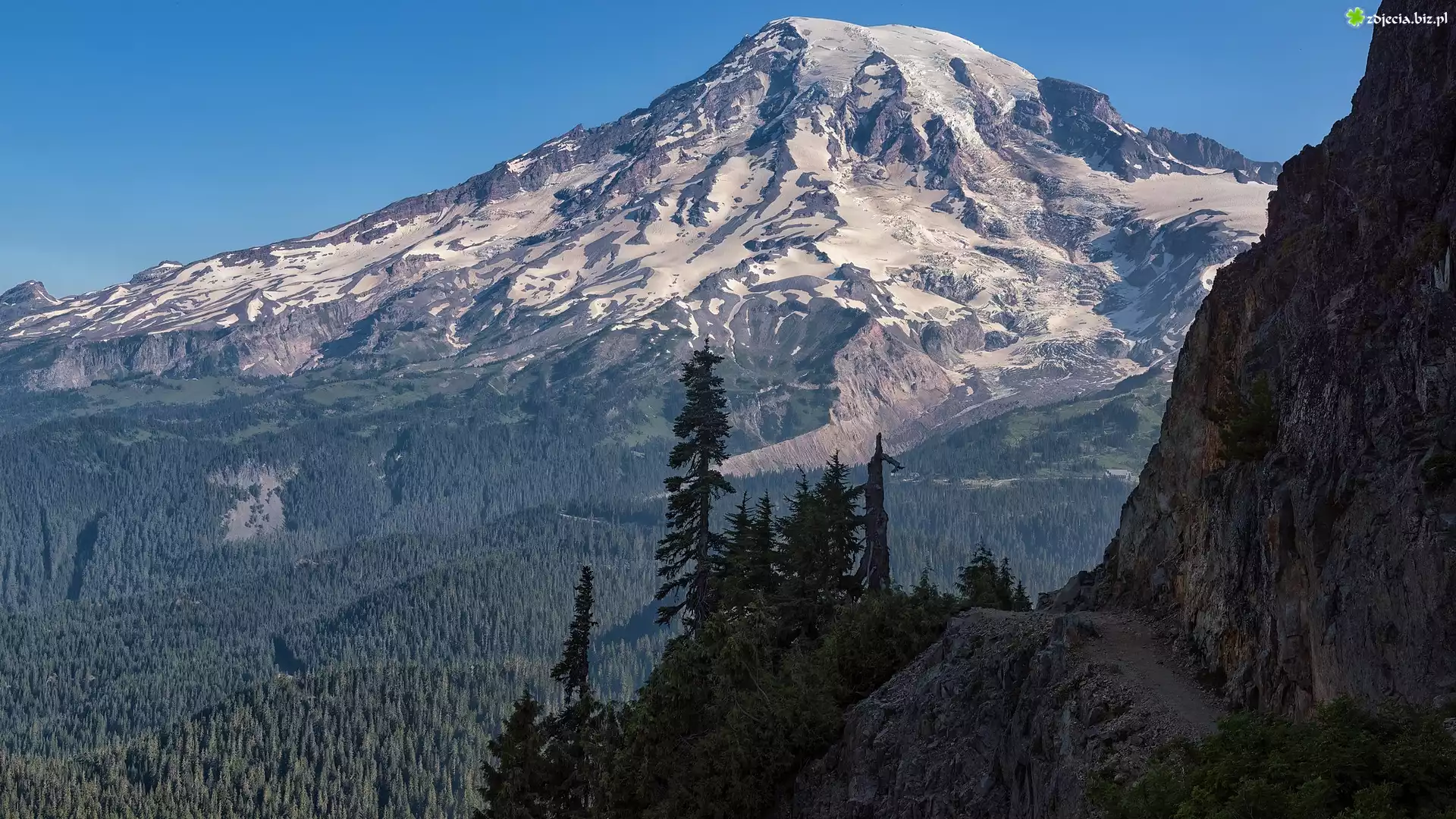 Zdjęcie Ośnieżone, Góry, Stratowulkan Mount Rainier, Drzewa, Świerki, Skały, Park Narodowy Mount Rainier, Stan Waszyngton, Stany Zjednoczone |